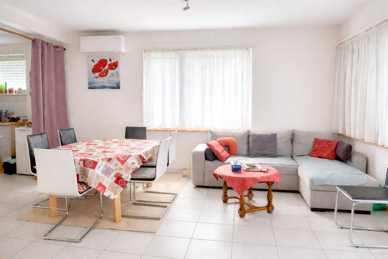 Au rez-de-chaussée, une première entrée avec placard mural mène à une pièce de vie avec cuisine équipée ouverte. L'espace comprend également une chambre, une salle de bains ainsi qu'un WC séparé. Ce logement est actuellement loué, offrant ainsi un revenu locatif immédiat. Cet appartement est actuellement loué avec un revenu annuel de 5 400 EUR hors charges.