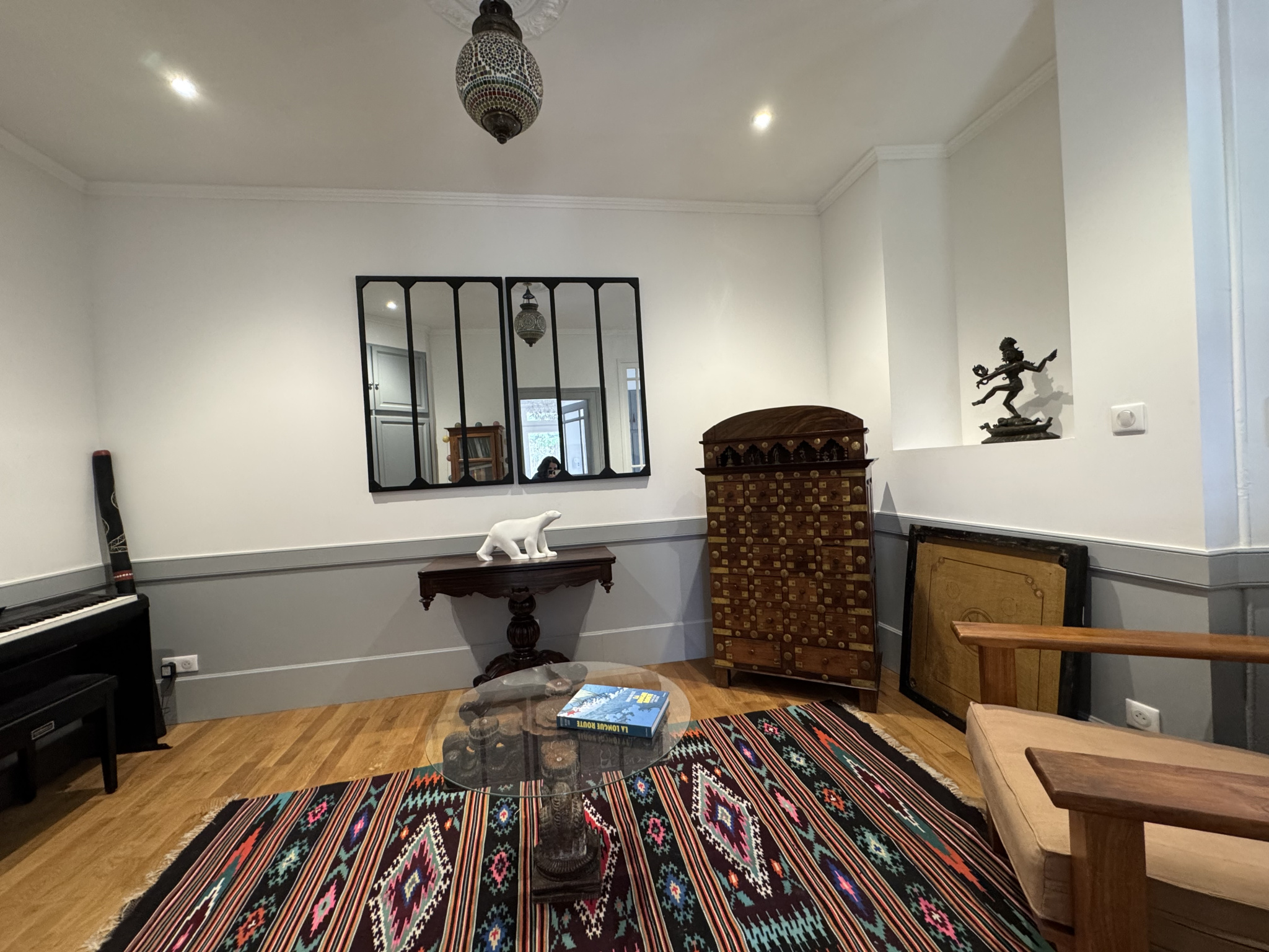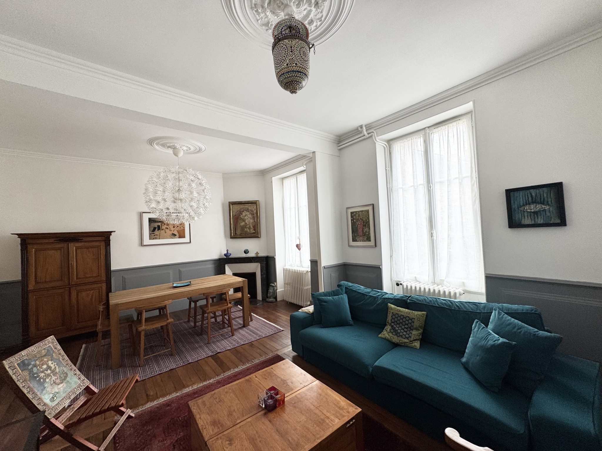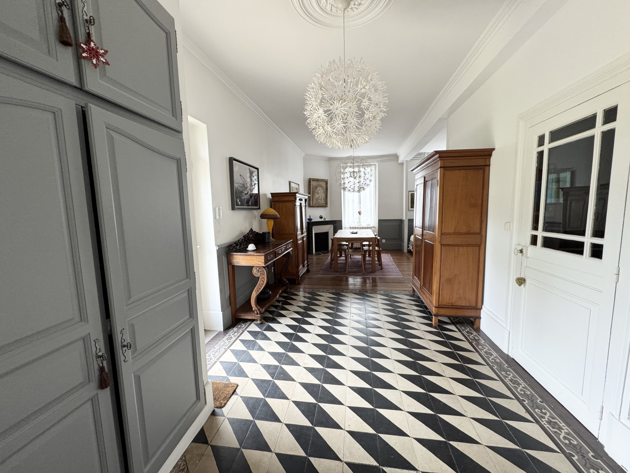 Dès l'entrée, vous apprécierez les carreaux de ciment et la belle hauteur sous plafond. La maison offre un agréable séjour-salon avec parquet et cheminée, ainsi qu'un bel espace salon-bibliothèque.