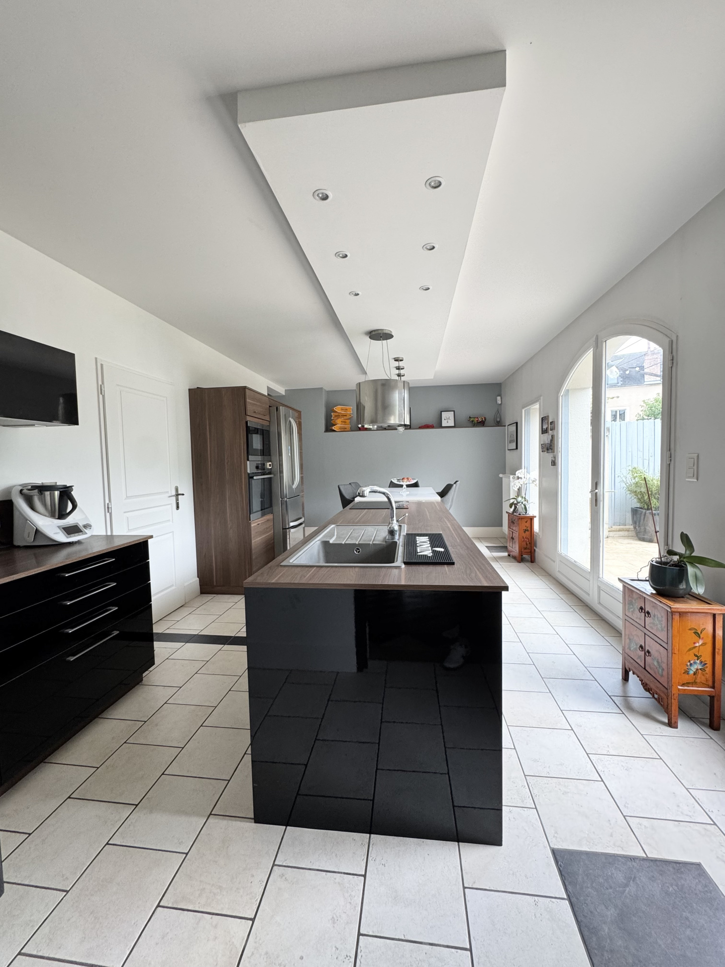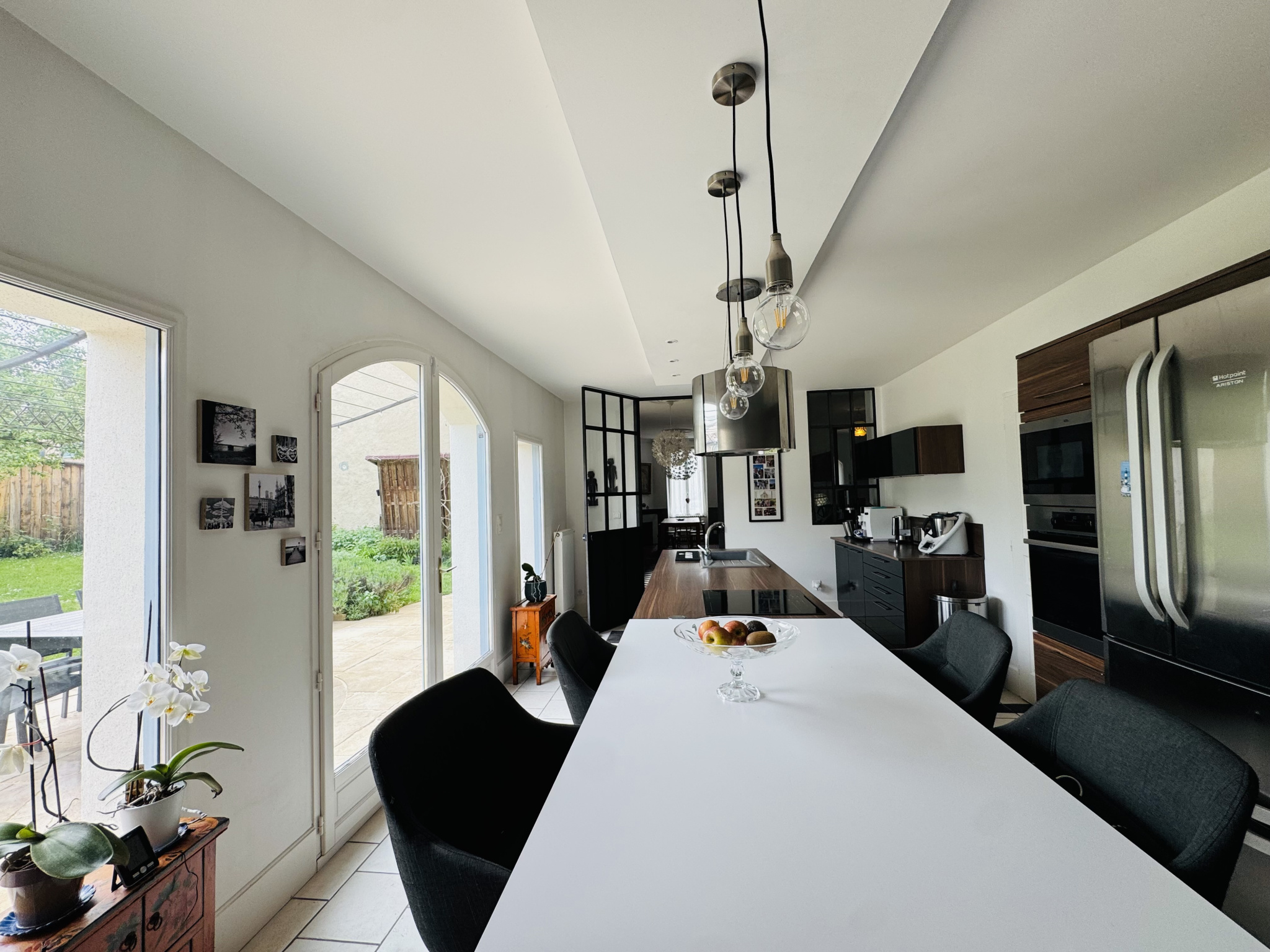La cuisine, aménagée et équipée, est un véritable atout : sublimée par une verrière et une porte industrielle, elle dispose d'un îlot central et d'un espace repas convivial, avec un accès direct à la terrasse, sa pergola et son jardin exposé plein sud.