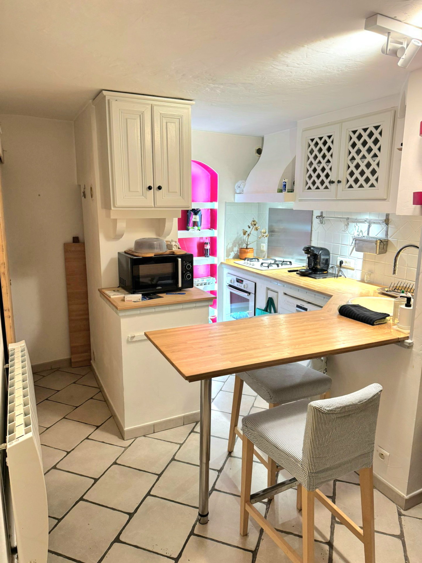 Cuisine équipée avec mange-debout sur mesure, modulable pour accueillir jusqu'à 6 personnes