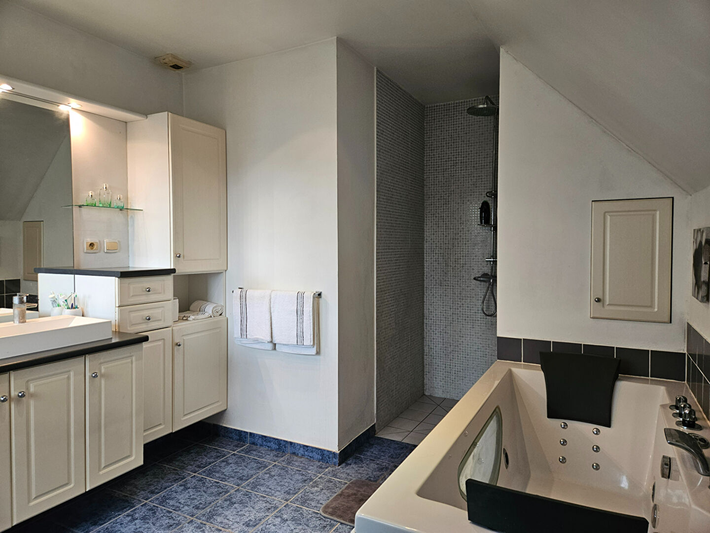 A l'étage, on accède à 4 chambres, une salle de douche et une salle de bains.