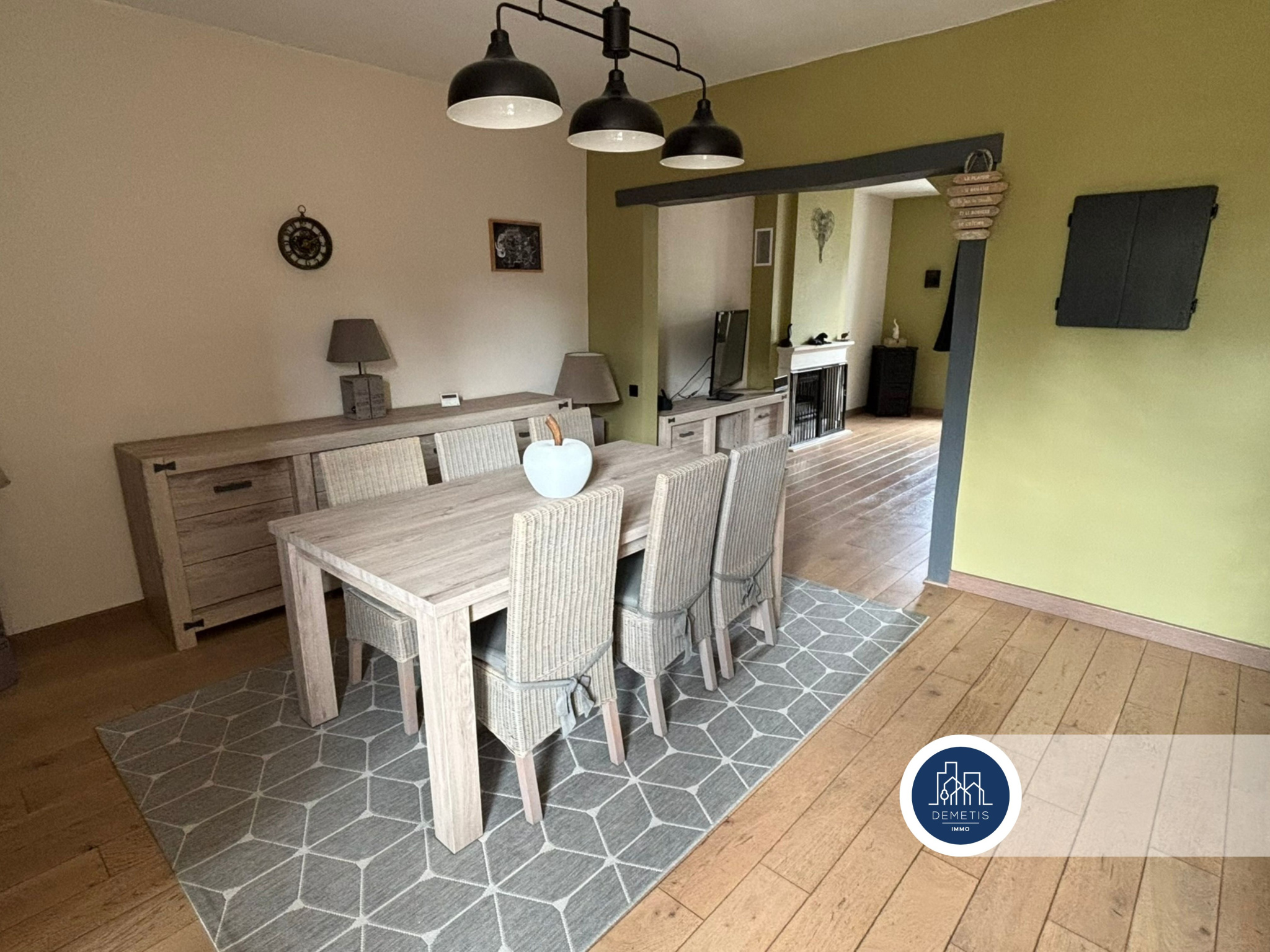 La pièce de vie, d'environ 43 m2, séduit par son atmosphère chaleureuse avec sa cheminée à insert et son élégant sol en chêne massif. La cuisine indépendante, équipée d'un piano de cuisson, s'ouvre à la fois sur la terrasse et sur le séjour, favorisant les moments de partage.