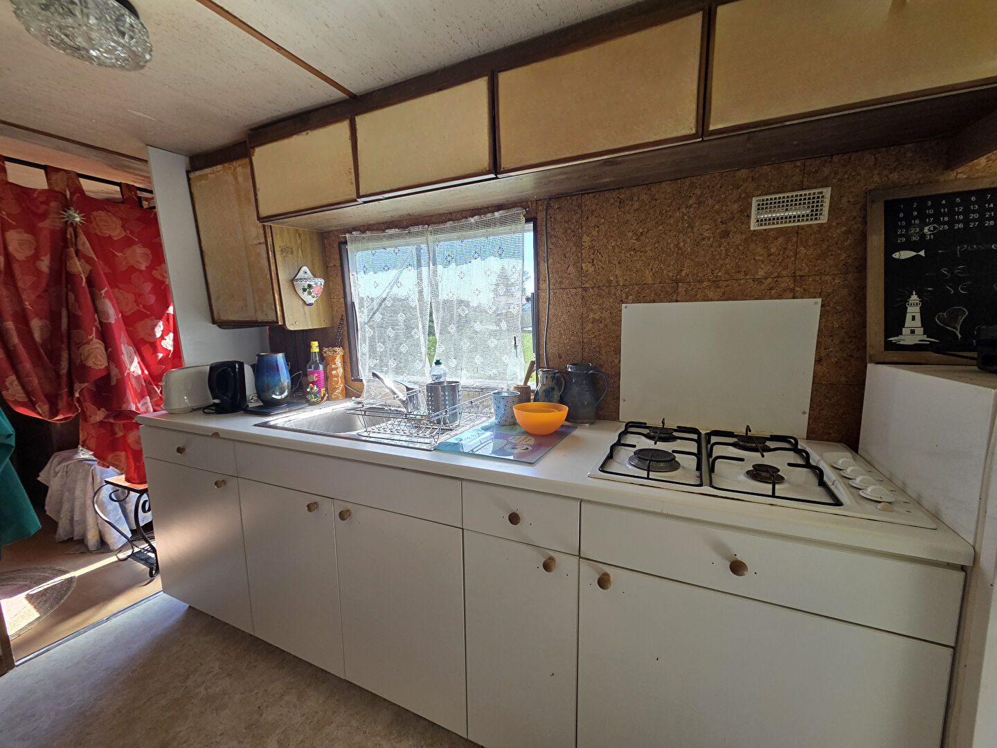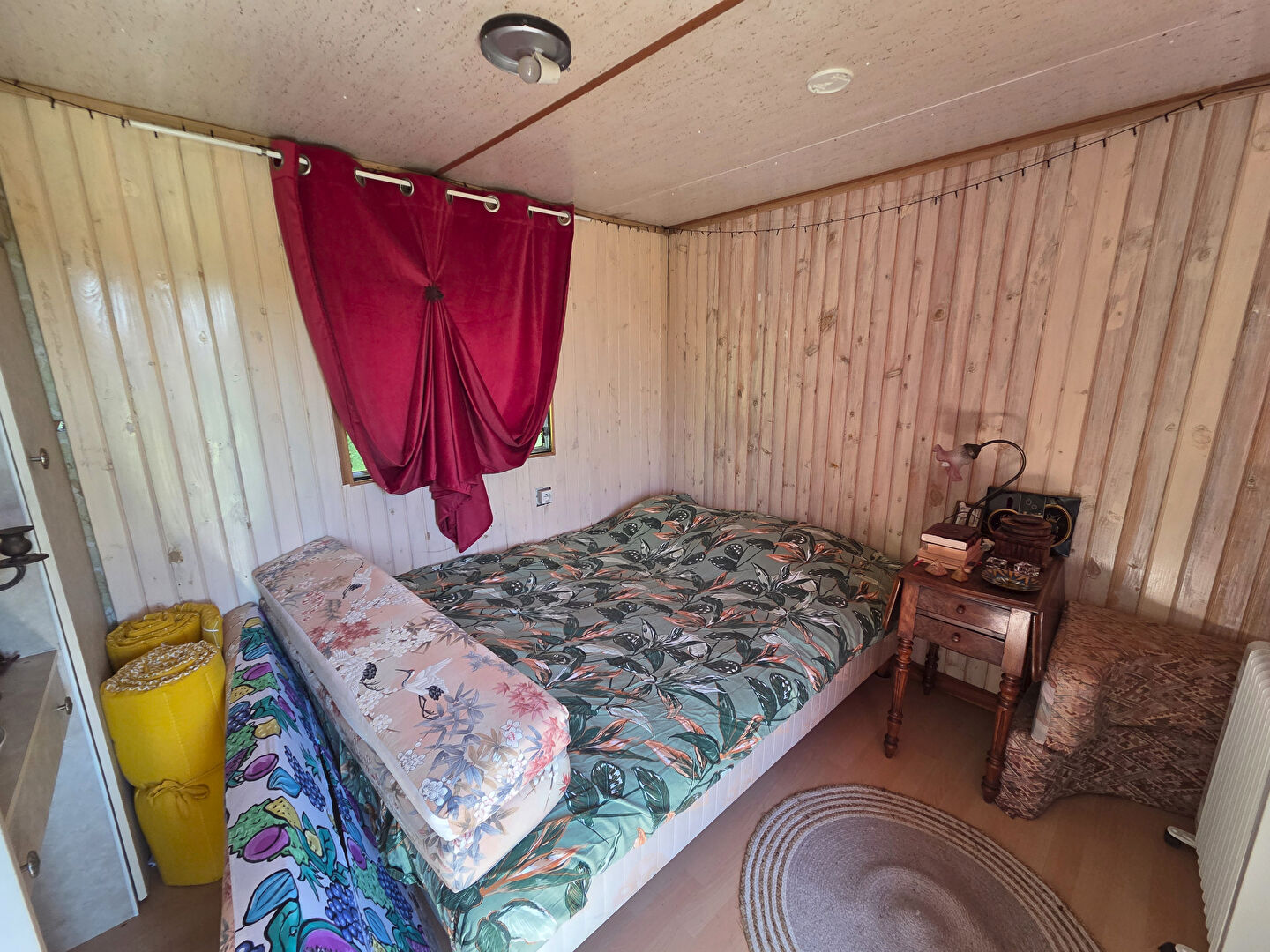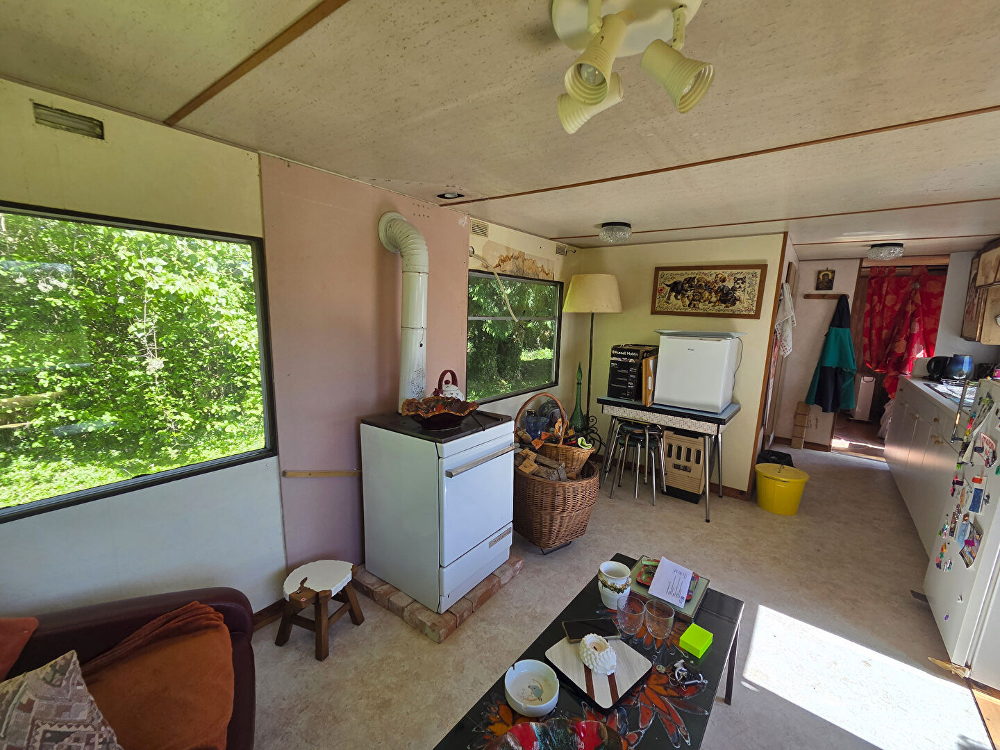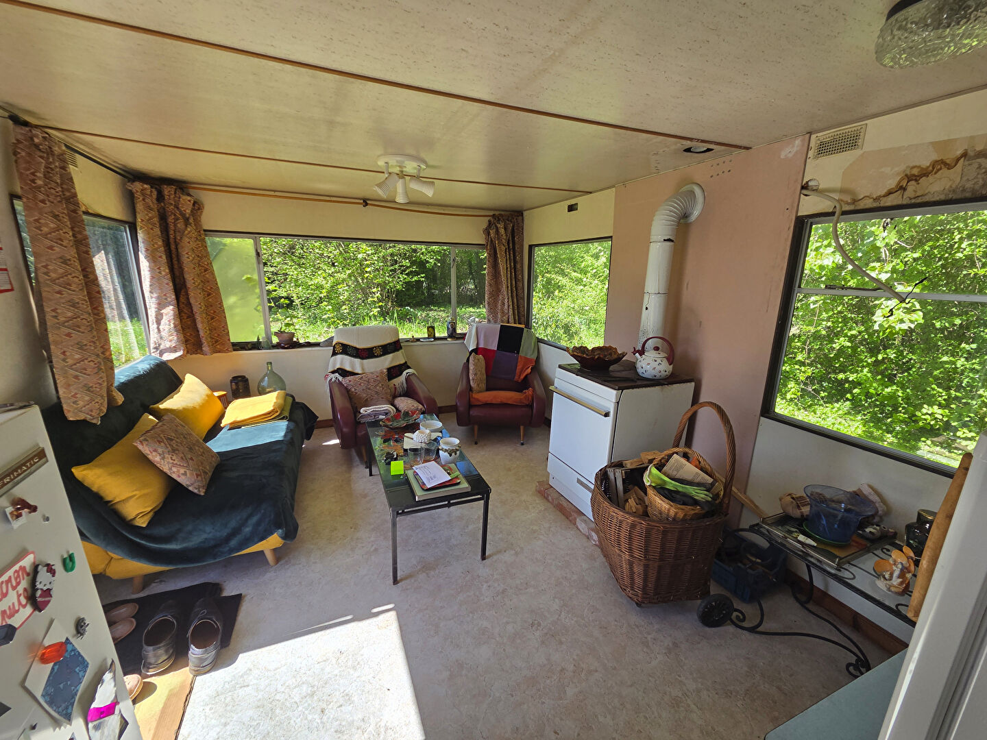 Un mobil-home sur roues est déjà installé sur la parcelle, vous permettant de profiter immédiatement du site. Il offre un espace de vie fonctionnel et convivial avec un salon, une cuisine ouverte, une salle d'eau avec WC ainsi qu'une chambre, réunissant tout le confort nécessaire pour vos séjours.