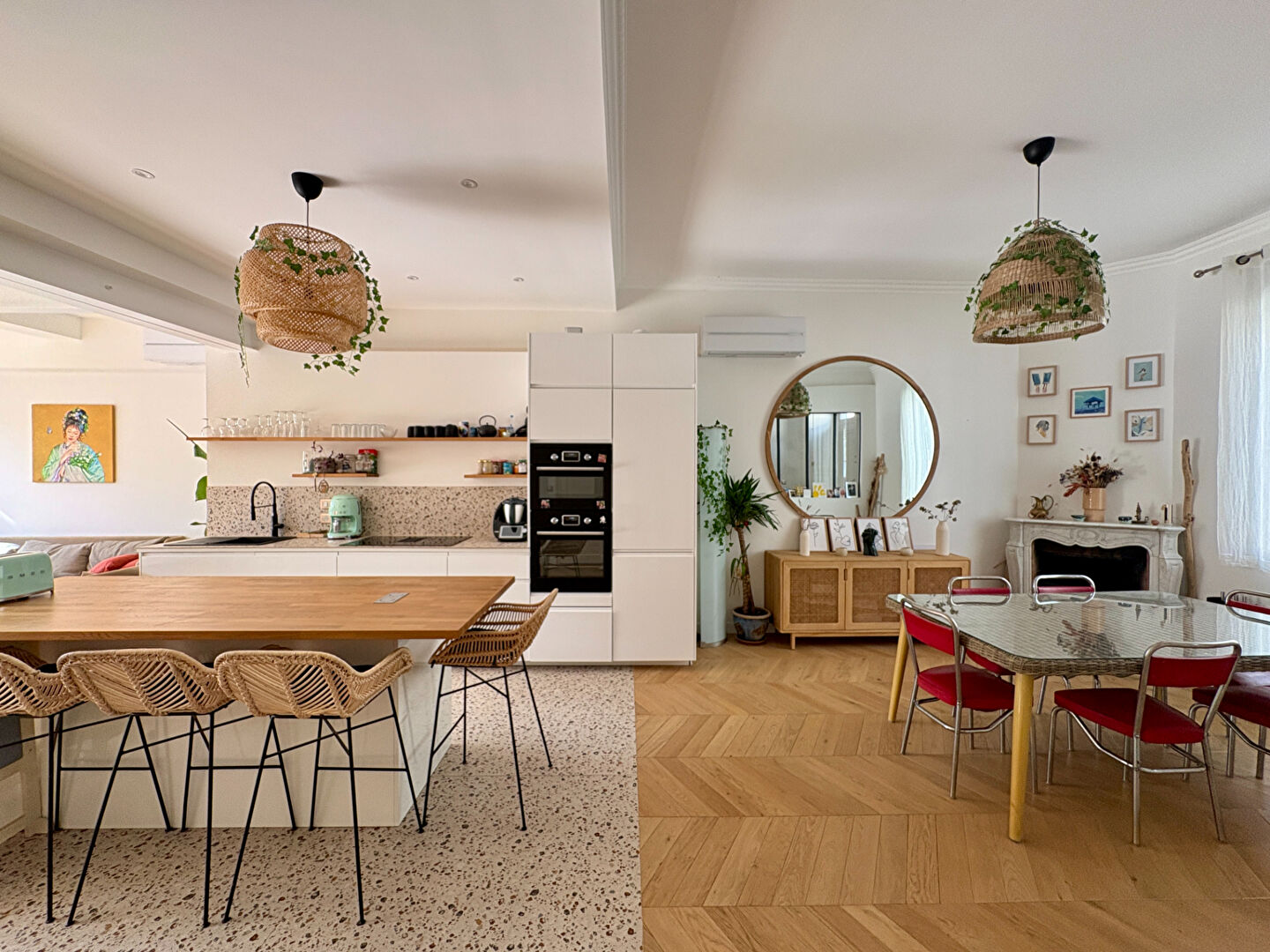 - Pièce de vie de plus de 60 m² avec cheminée fonctionnelle, cuisine ouverte, salle à manger et salon