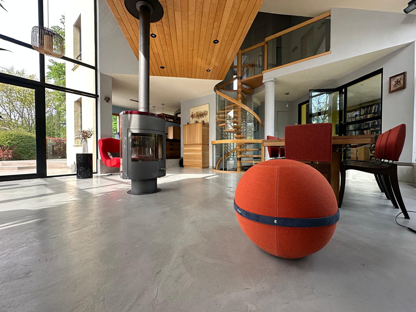 Les hauteurs sous plafond subliment les espaces, tandis que le poêle à bois devient le coeur des soirées chaleureuses.