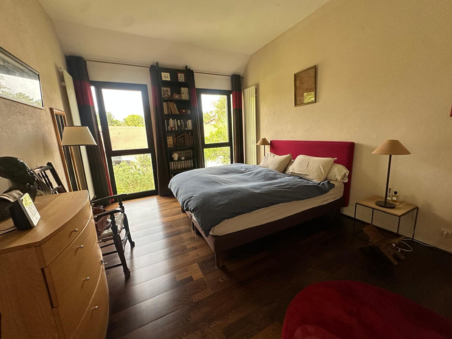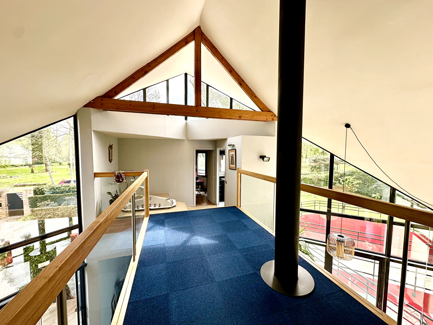 À l'étage, une coursive ouverte sur le séjour crée une perspective unique et renforce la sensation de volume et de liberté ; l'espace nuit allie confort et intimité : trois chambres, dont deux avec accès balcon, ainsi qu'un bureau idéal pour le télétravail ou les projets personnels ; une salle de bain, une salle d'eau et des sanitaires indépendants viennent parfaire cet étage.
