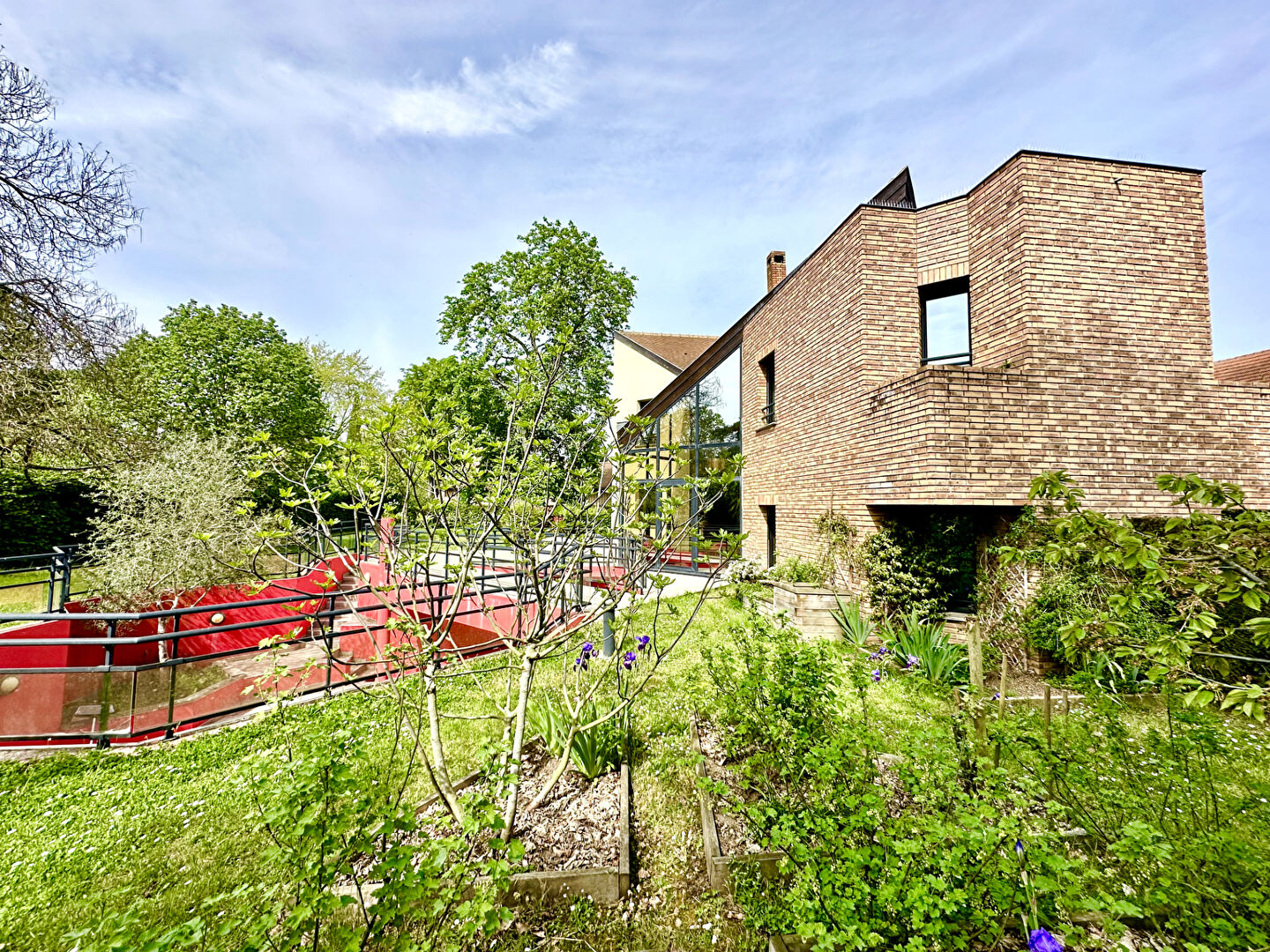 À l'extérieur, le jardin paysager sur une parcelle de 1544 m² entoure la maison d'une atmosphère apaisante.