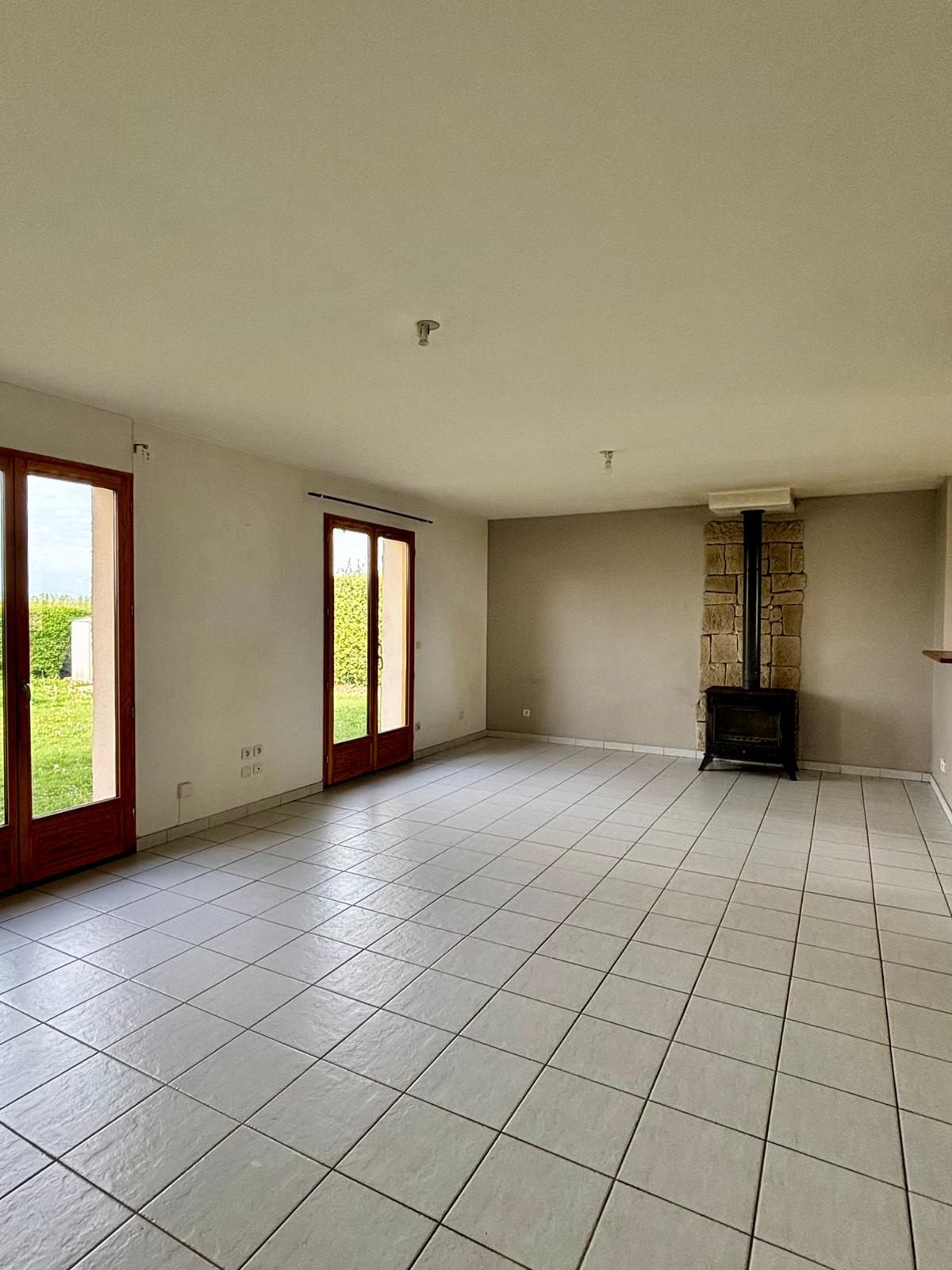 La cuisine aménagée s'ouvre sur un vaste séjour baigné de lumière, où un poêle à bois crée une ambiance chaleureuse et conviviale, idéale pour partager de beaux moments en famille ou entre amis.