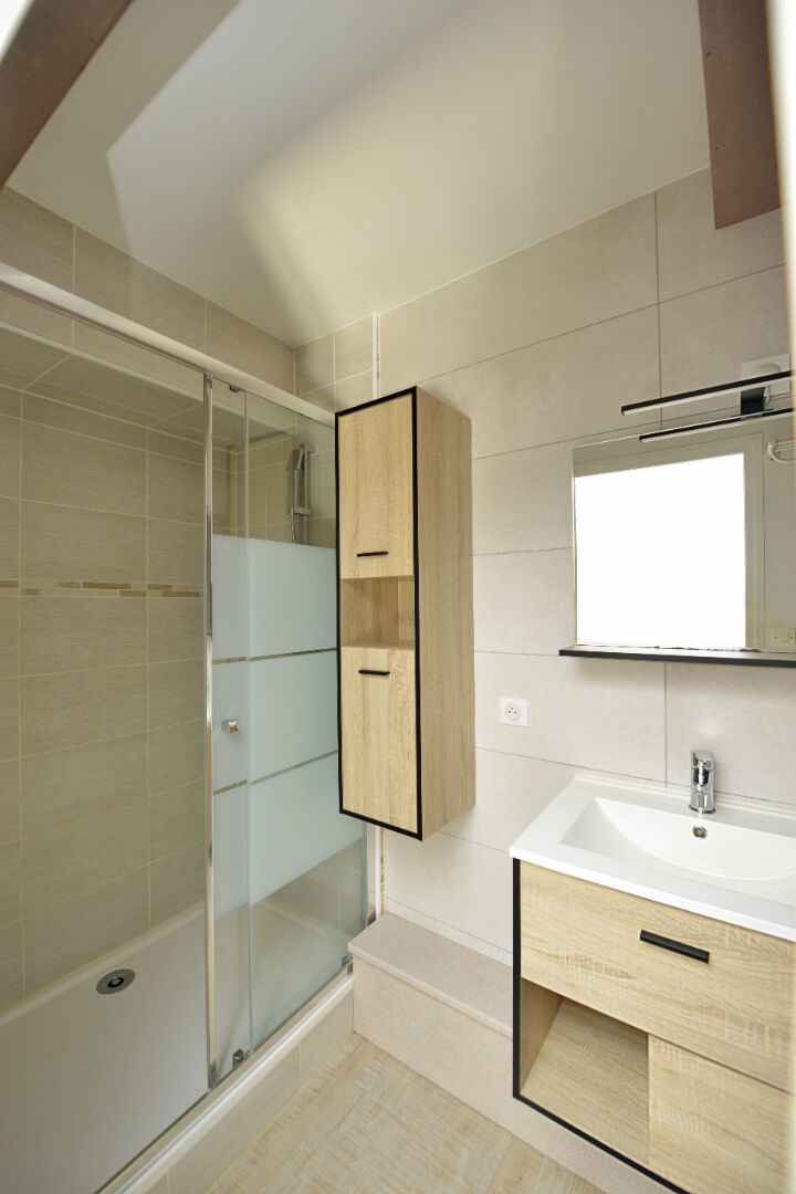 Il se compose d'une grande pièce de vie avec cuisine aménagée, une salle d'eau neuve avec wc, une chambre avec mezzanine et placard.