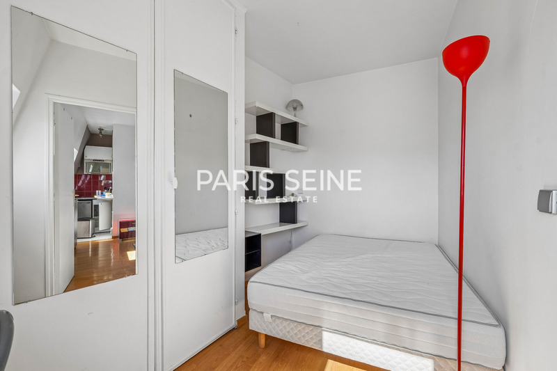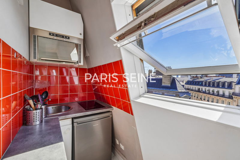 Cet appartement situé au 6ème et dernier étage sans ascenseur bénéficie d'une belle luminosité et d'une vue dégagée sur les toits de Paris et la tour Eiffel.
