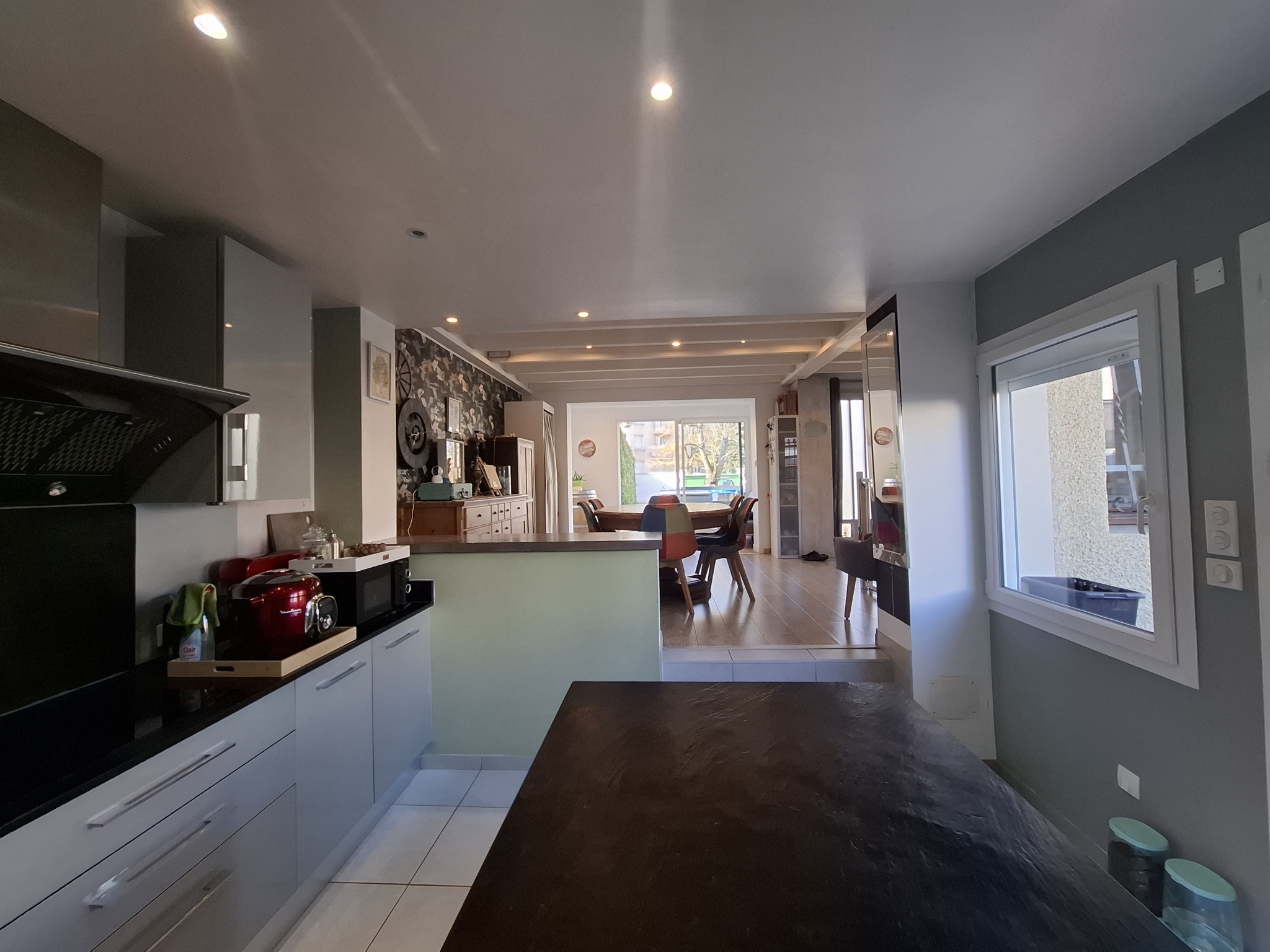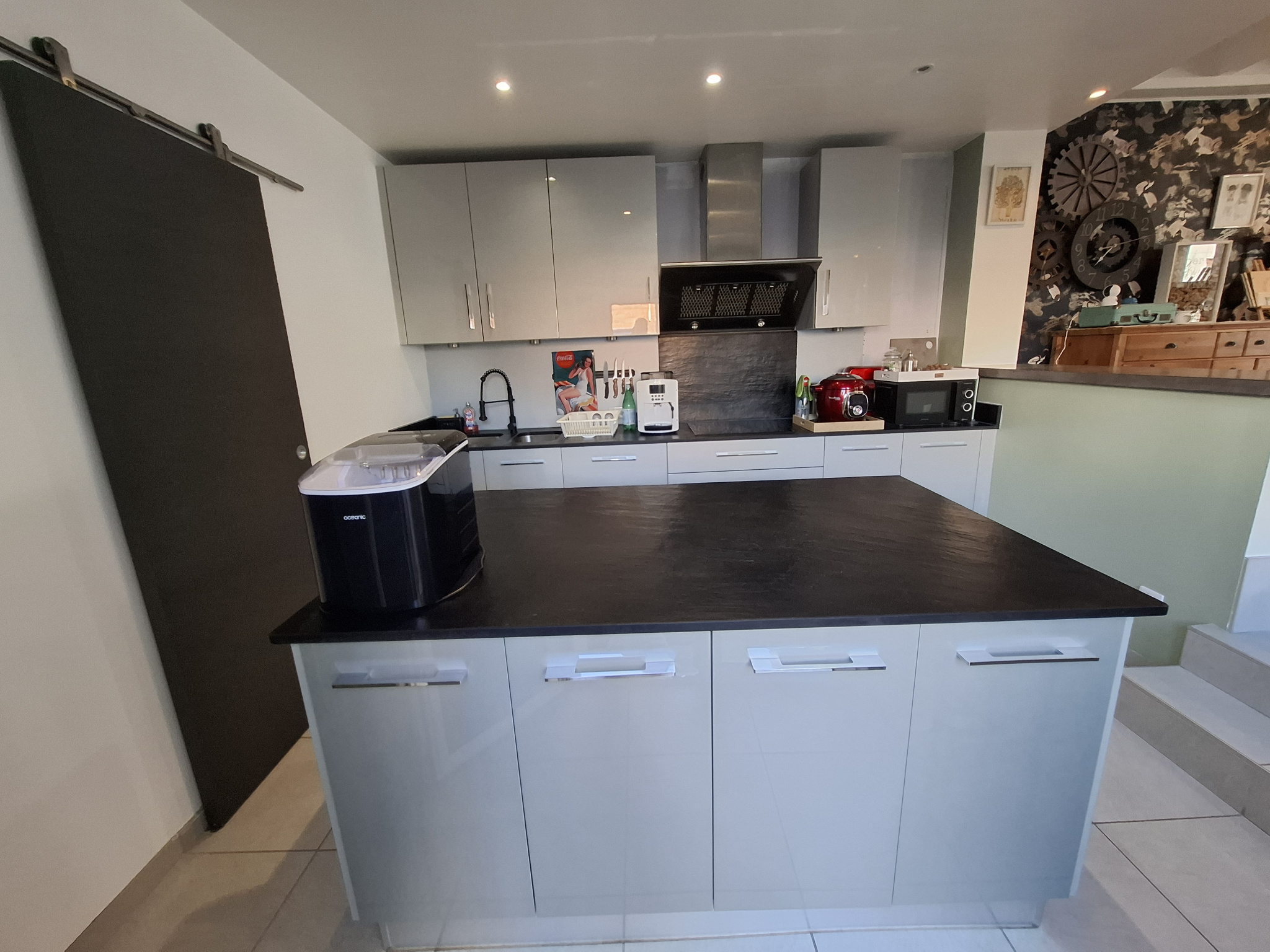 On descend quelques marches sur une cuisine JEAN DE MATHIEU ouverte de 11.68 m2 aménagée et équipée avec un îlot central et 2 portes fenêtres PVC double/vitrage et volets roulants motorisés dont une donnant sur une petite cour à l'arrière de la maison avec une partie couverte pour entreposer le bois et un chalet métallique avec électricité.