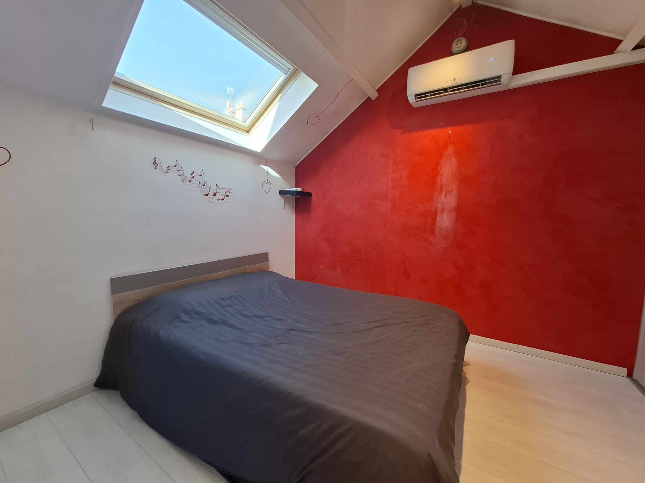 A l'étage, un palier de 1.43 m2, une première chambre de 8.89 m2 avec un vélux, un placard JEAN DE MATHIEU et la climatisation réversible, une deuxiéme de 9.21 m2 avec un vélux et un grand placard JEAN DE MATHIEU et d'une troisième de 9.72 m2 avec une fenêtre PVC double/vitrage et un volet roulant motorisé, deux placards en sous-pente, une douche fermée et la climatisation réversible et d'une salle de bain de 3.12 m2 avec un vélux et un wc.