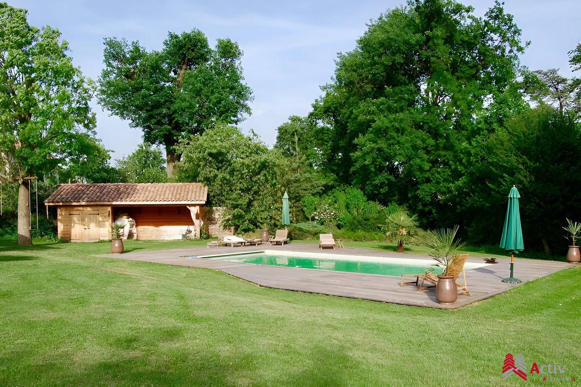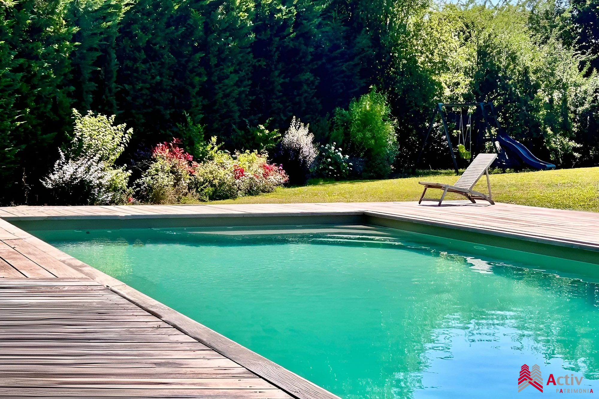 Le jardin, plat et soigneusement paysager, accueille une grande piscine, un terrain de pétanque ainsi que des espaces, ici et là, pour profiter des beaux jours et de l'arrière saison.