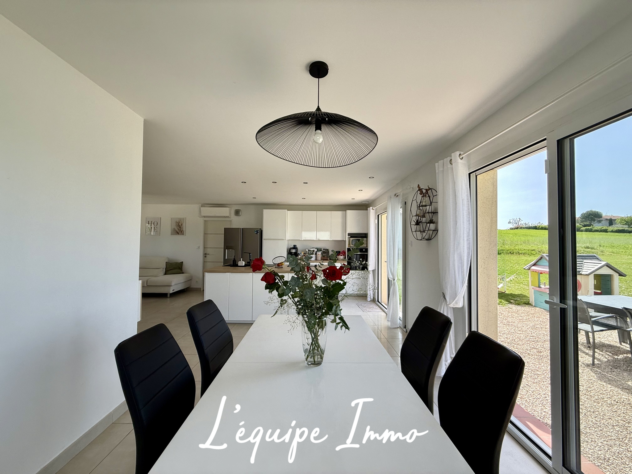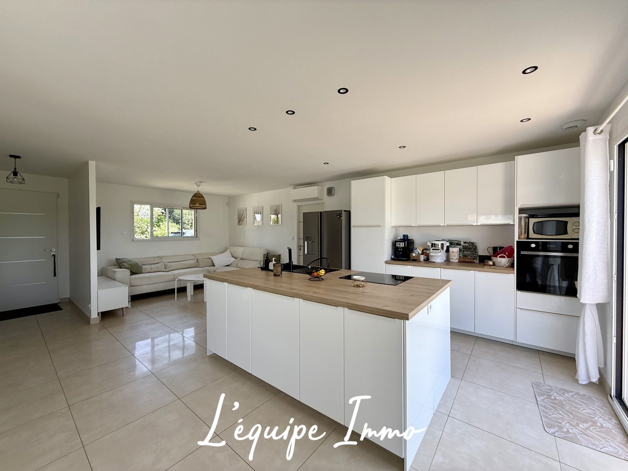La maison s'organise autour d'une pièce de vie très lumineuse, avec cuisine ouverte, créant un espace convivial et moderne, idéal pour la vie de famille et les moments de partage.