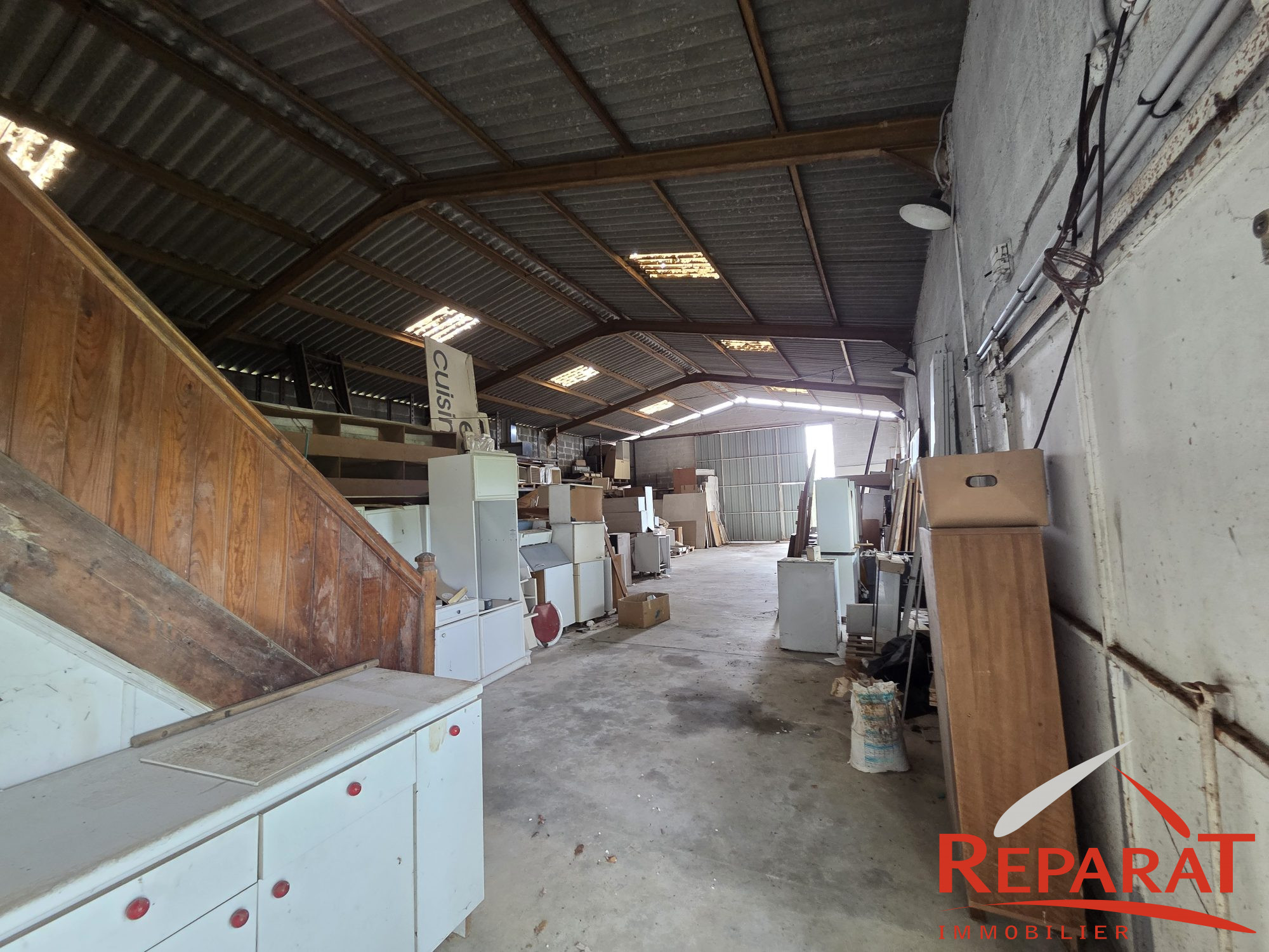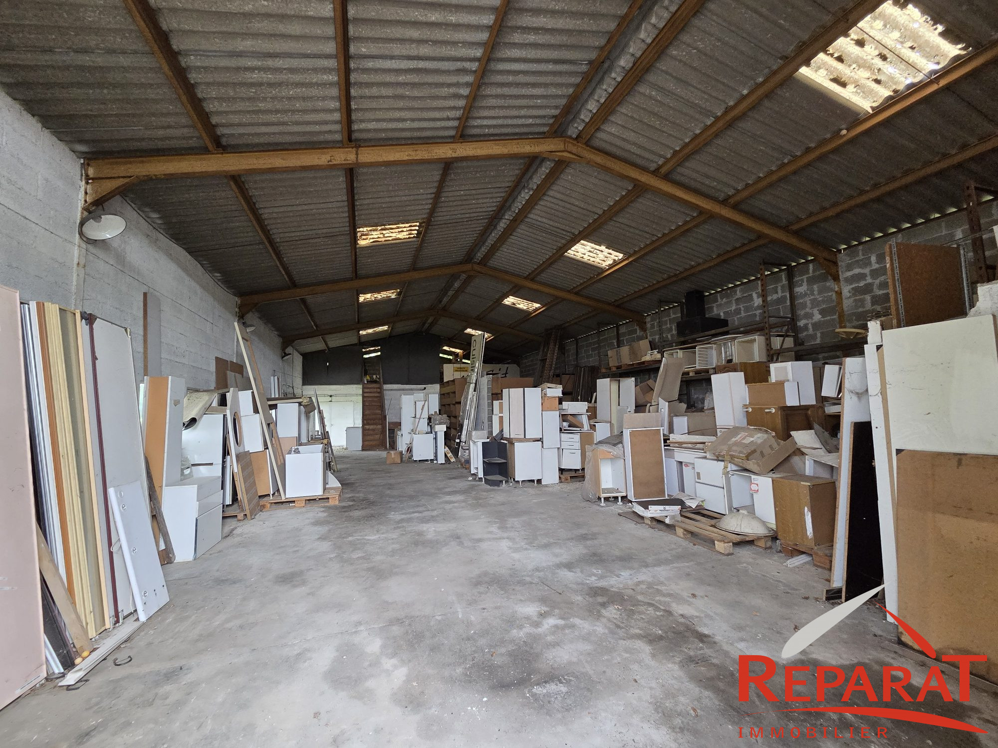 Le bâtiment principal, d'environ 250 m², est construit en parpaing, couvert en fibrociment et repose sur une dalle béton. Il est en bon état général et se prête parfaitement à un usage d'atelier, d'entrepôt ou de stockage, avec la possibilité d'y aménager des bureaux selon vos besoins.