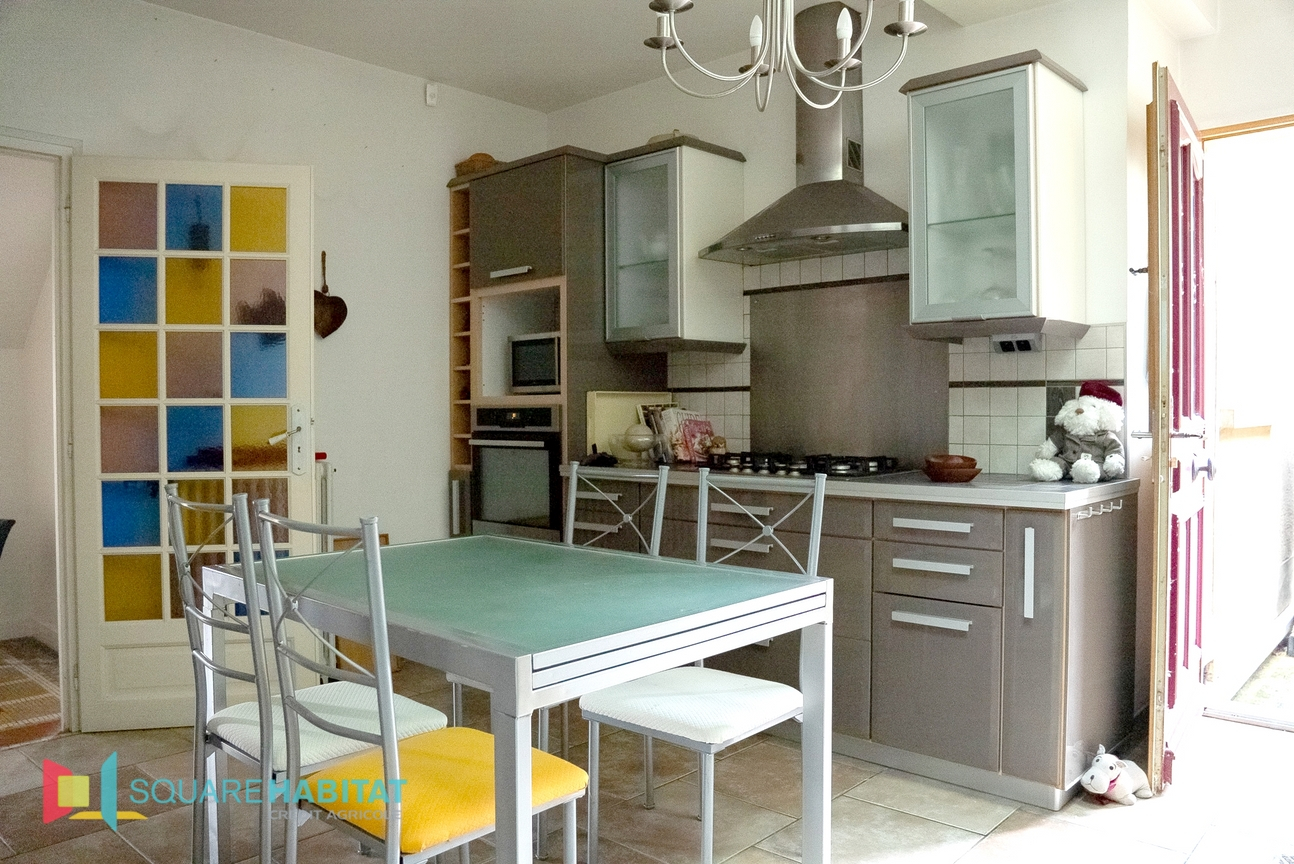 Au rez-de-chaussée : un T2 comprenant un grand séjour avec cheminée, une cuisine, une buanderie, une chambre, une salle d'eau et un WC séparé.
