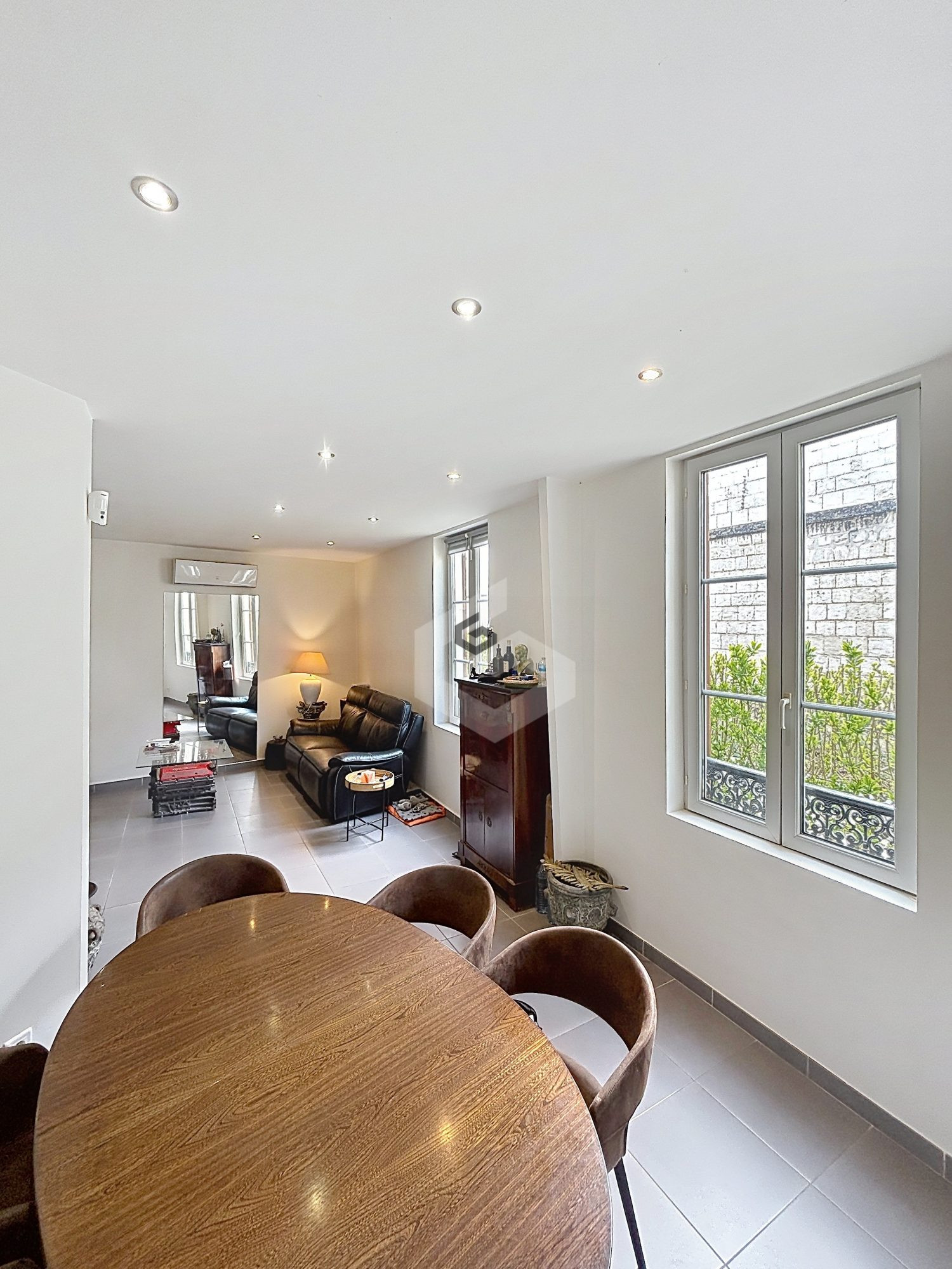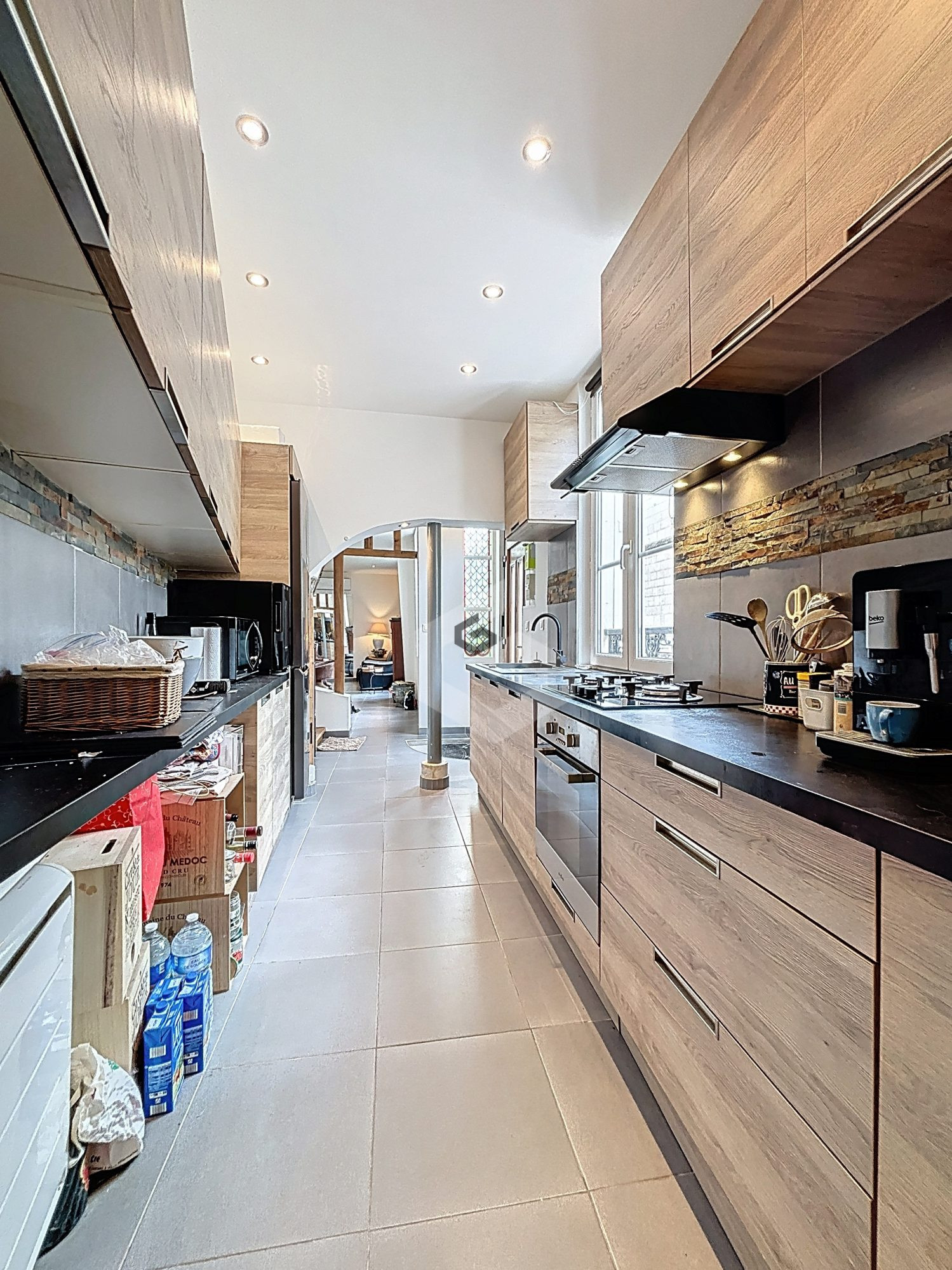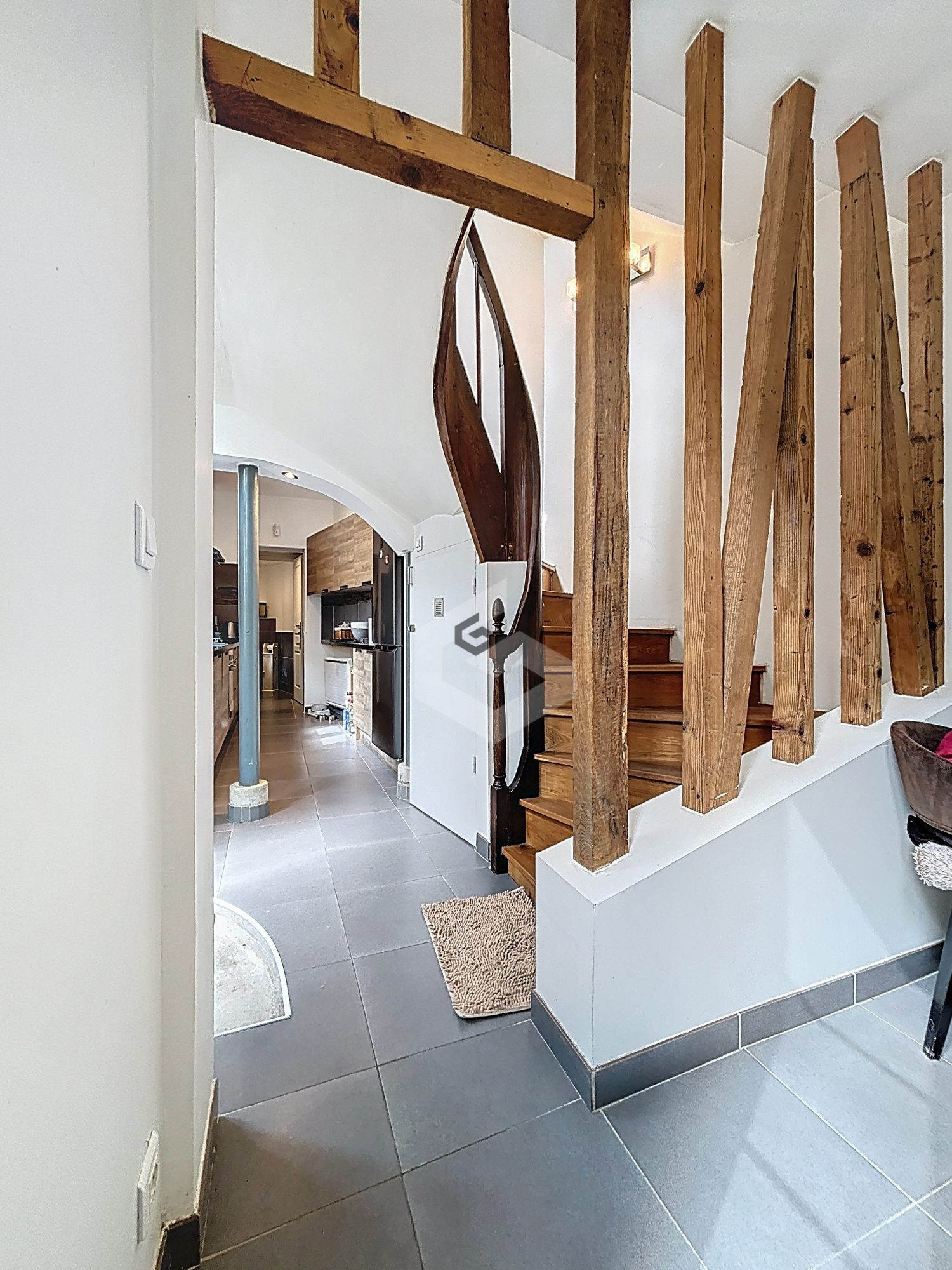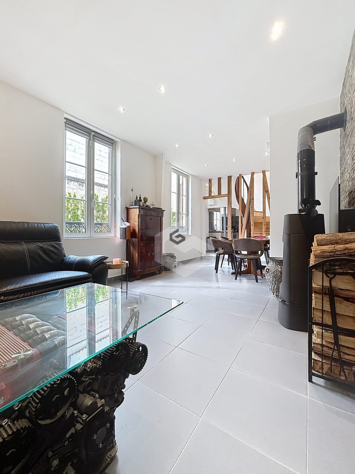 Charmante maison de ville ancienne de 100m2 environ rénovée en 2018 (R+2) comprenant : une entrée 3,20m2, une cuisine ouverte et aménagée 5,75m2, un séjour avec poêle à bois/granulés de 24m2, un dégagement 1,59m2 avec penderie, un WC 1,97m2, une descente de cave, une montée d'escalier en bois avec poutres apparentes, un pallier, une chambre 11,09m2 donnant l'accès à une chambre en enfilade de 13,30m2 (possibilité de réaliser un grand dressing), une salle de douche 6,04m2, un WC 1m2, une montée d'escalier, un pallier, une chambre sous mansardes 10,42m2 donnant l'accès à une seconde chambre en enfilade 10,93m2, une salle de bains 6,89m2 avec WC. Cave saine. Huisseries