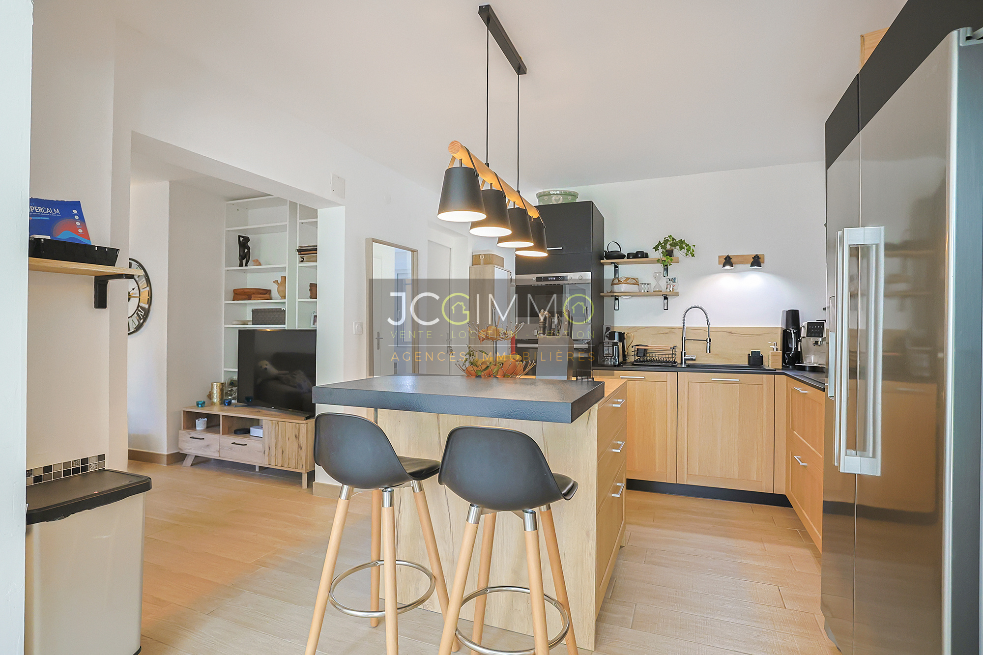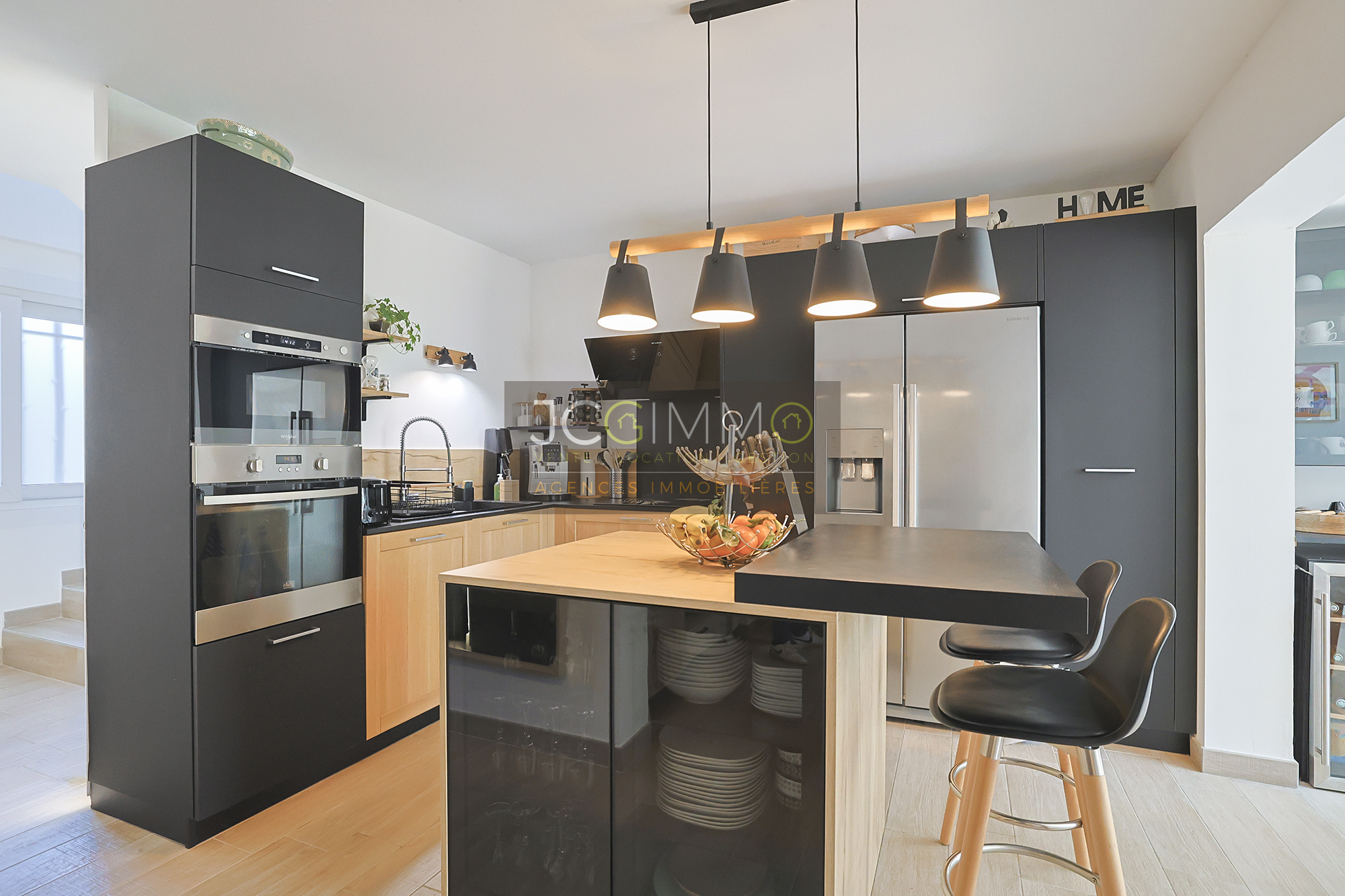 La cuisine américaine de marque HARMONY avec îlot central est entièrement équipée avec un électroménager de qualité.