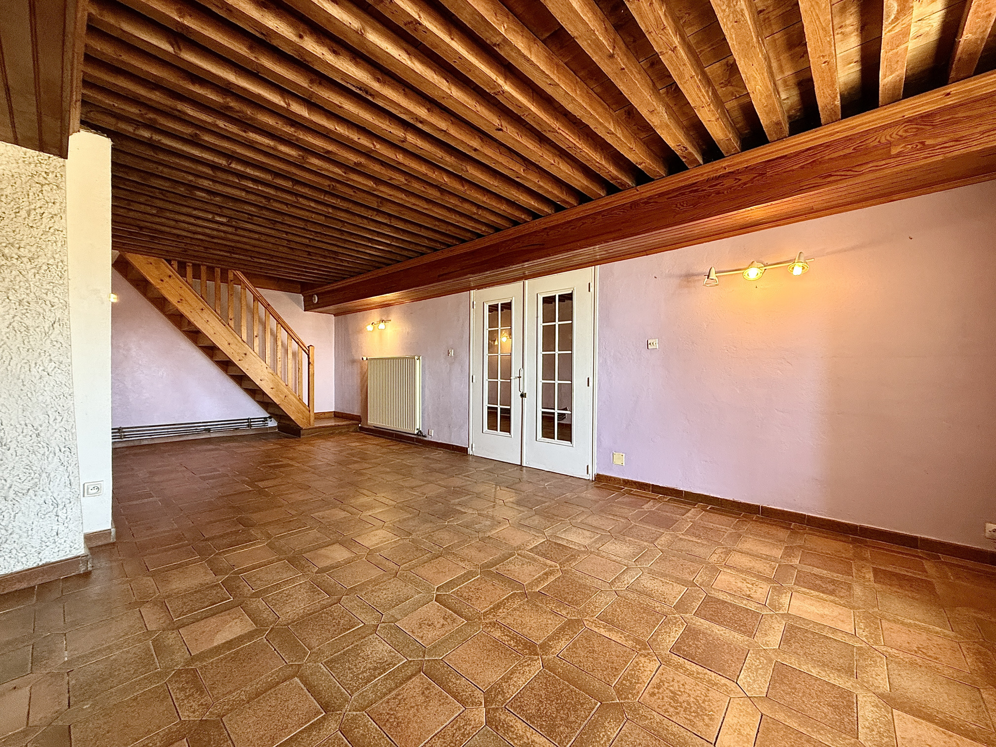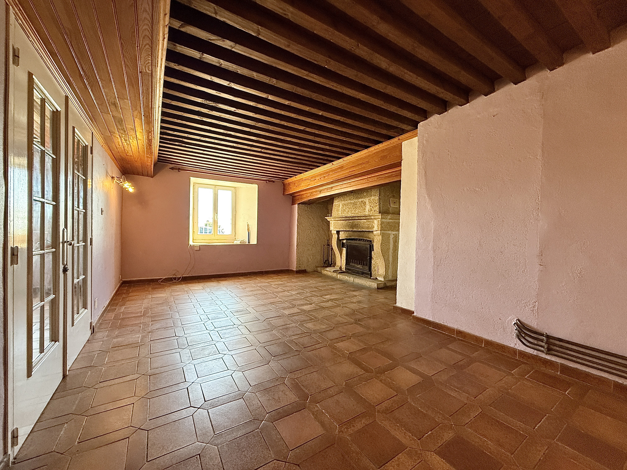 Dès l'entrée, vous découvrirez une pièce de vie ornée de plafonds à la française, ainsi que d'une cheminée à foyer fermé en pierres de taille.