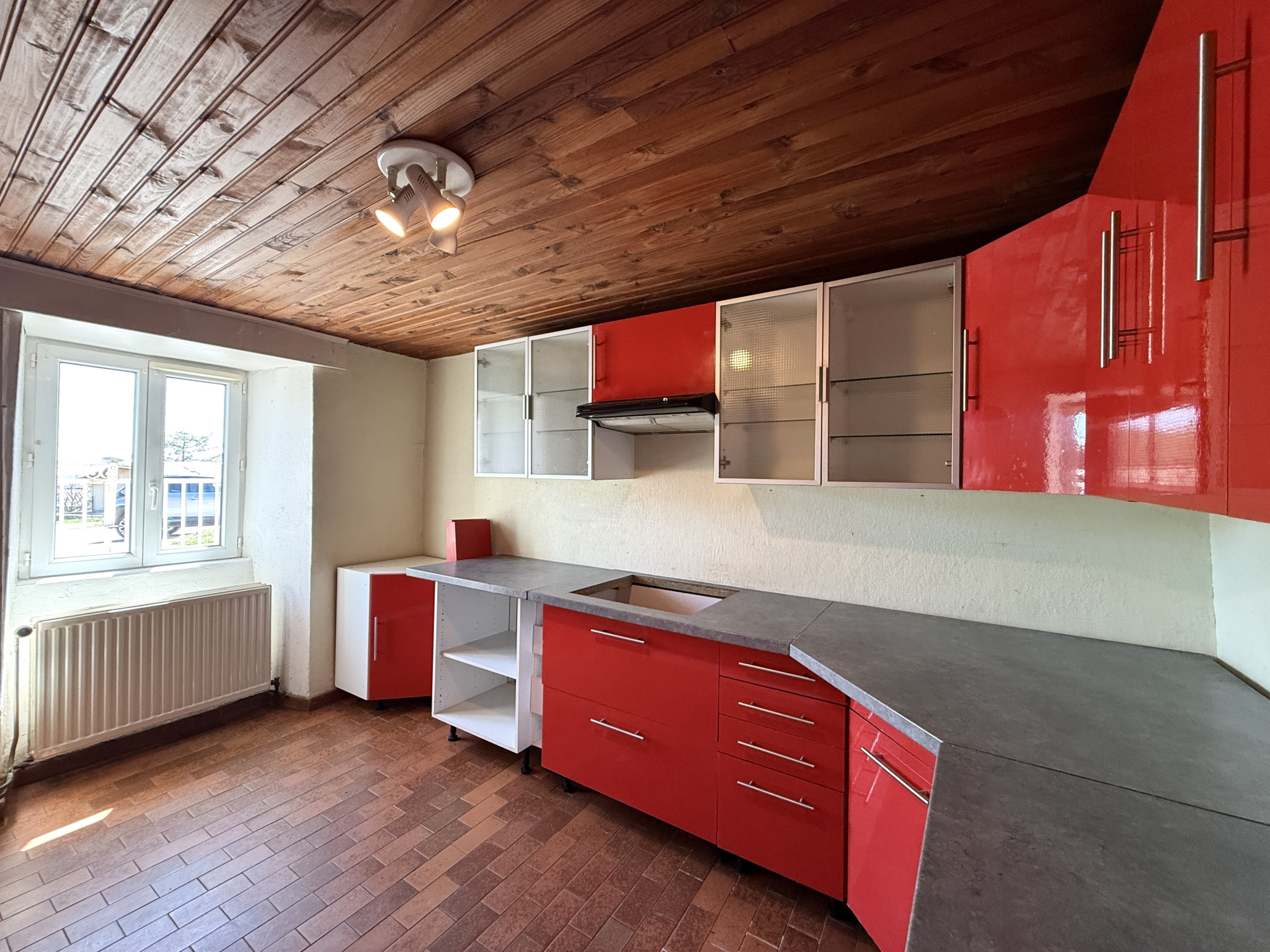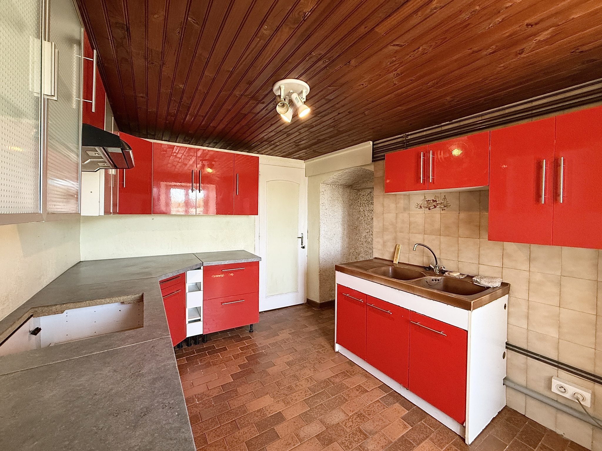 Dans la continuité, une cuisine meublée offrant un accès à la grange.