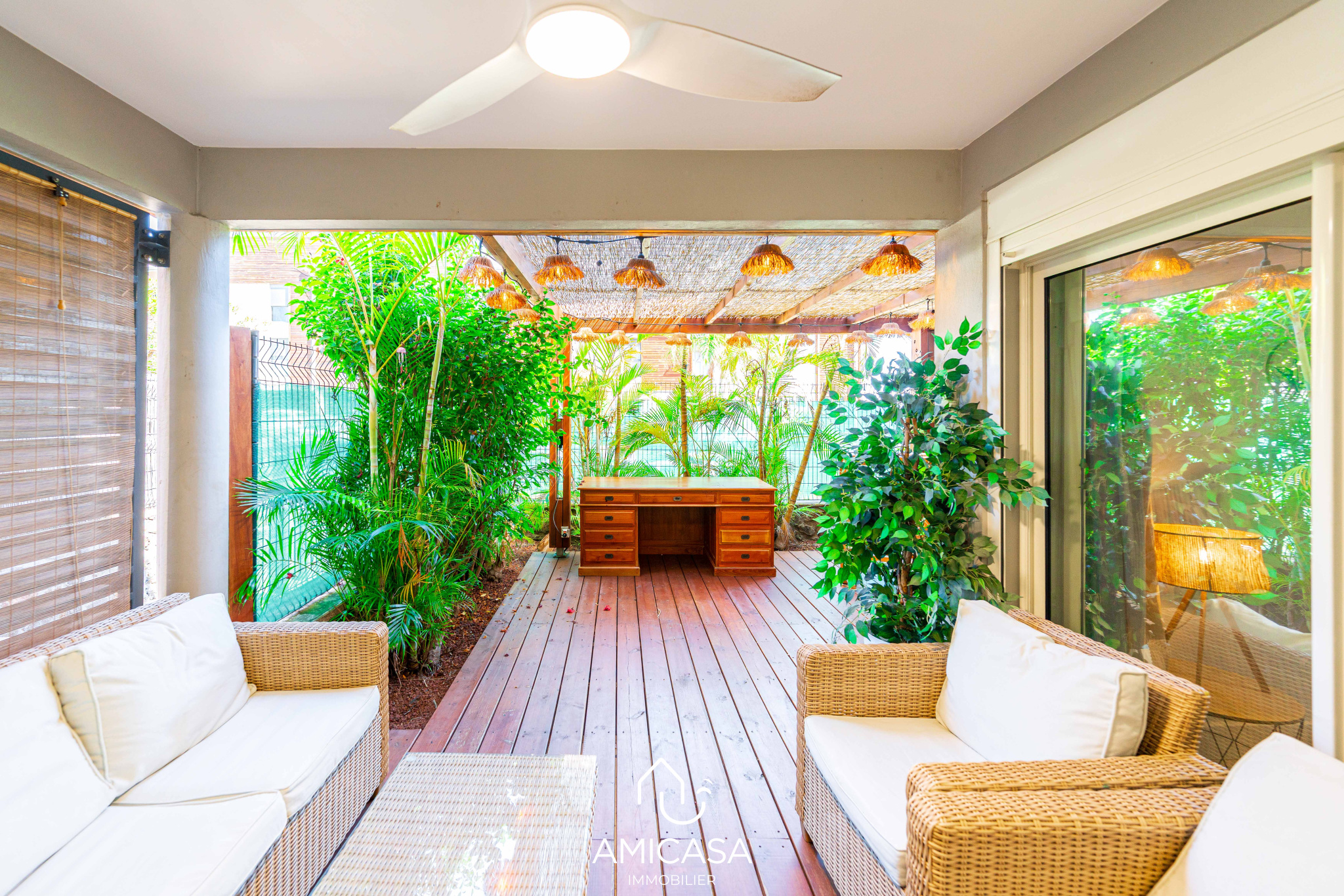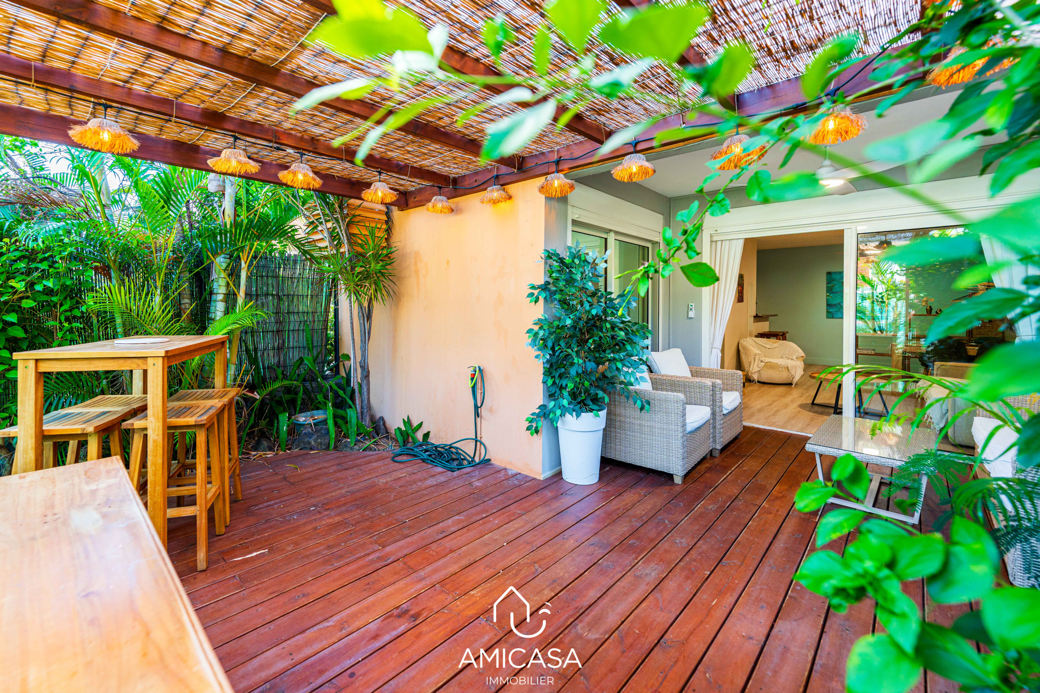 À l'extérieur, vous profitez d'une agréable varangue prolongée par un jardin privatif de 25 m2, idéal pour vos moments de détente en plein air.