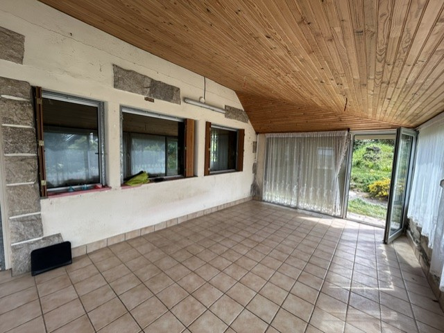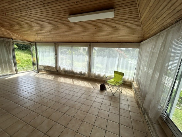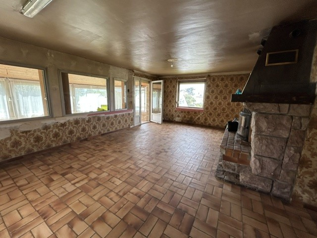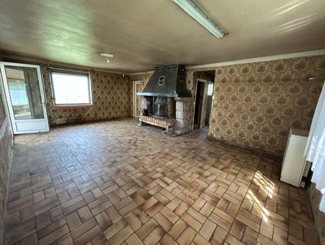 Au rez-de-chaussée surélevé: Séjour double avec cheminée de 35m2 donnnant sur extension de 26m2, cuisine, salle d'eau, pièce.