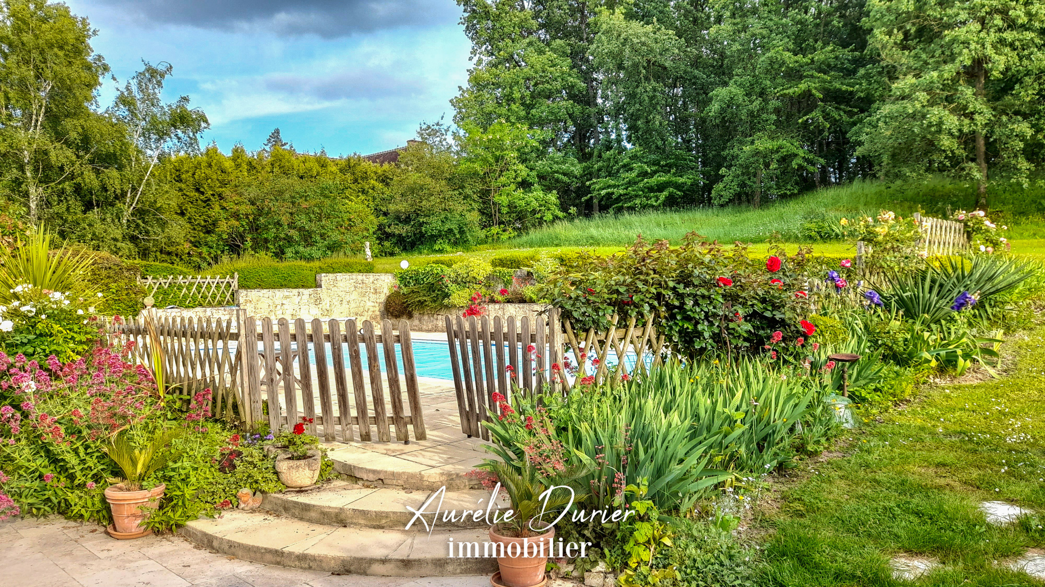À l'extérieur, le jardin paysagé est un véritable havre de paix. Une sublime terrasse en pierre prolonge naturellement les espaces de réception pour s'ouvrir sur une piscine. En lisière de propriété, un espace boisé privatif vient renforcer ce sentiment de dépaysement.