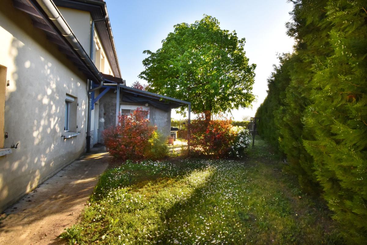 La parcelle d'environ 1300 m2 en bordure de champs comporte un espace parking, un coin avec piscine hors sol, un appentis en bois, une zone potager et un mini poulailler. Ici aussi les espaces peuvent être redistribués si création d'un deuxième logement.