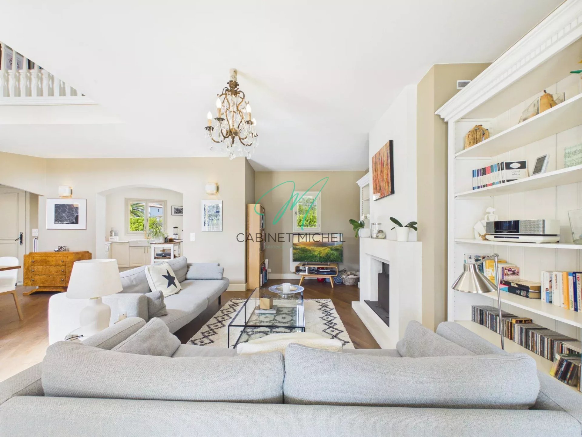 En rez-de-jardin : Un bel espace de vie lumineux avec séjour chaleureux agrémenté d’une cheminée à insert, un salon TV convivial, ainsi qu’une cuisine moderne entièrement équipée ouverte sur la pièce de vie.