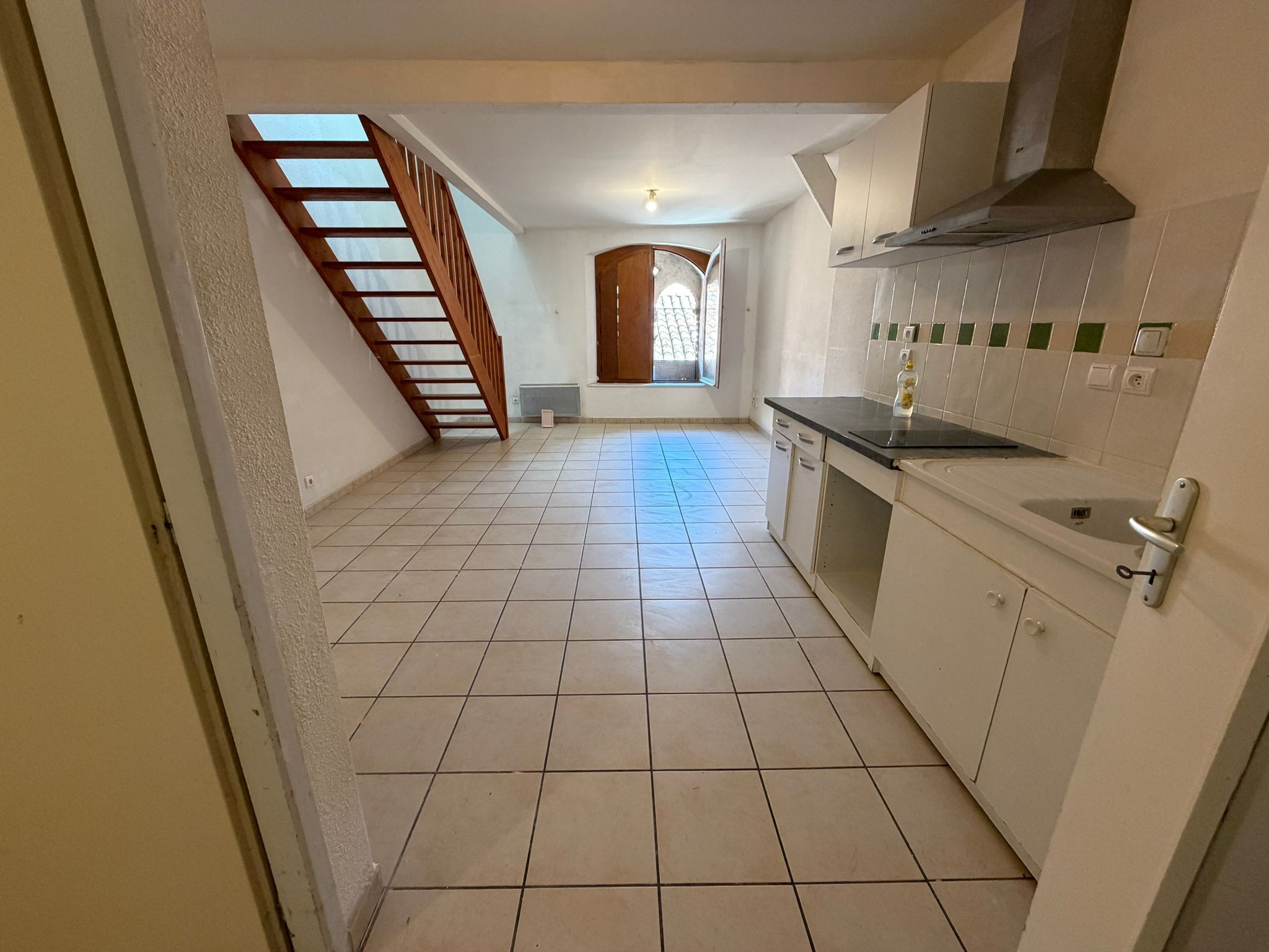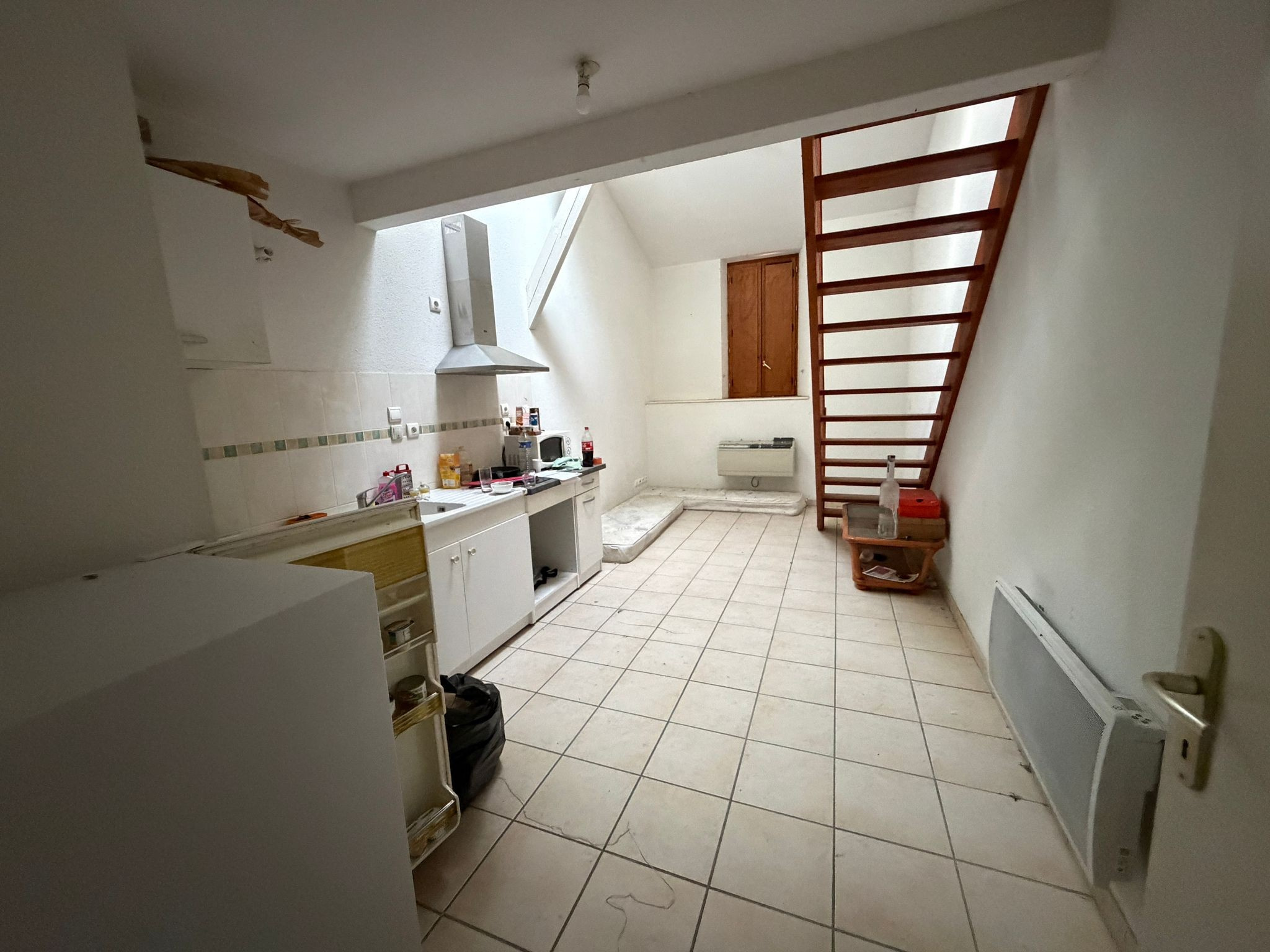 Un appartement T2 en duplex, côté place, comprenant une entrée, WC, cuisine ouverte sur séjour, et à l'étage : dégagement, une chambre, salle d'eau avec WC, placard.