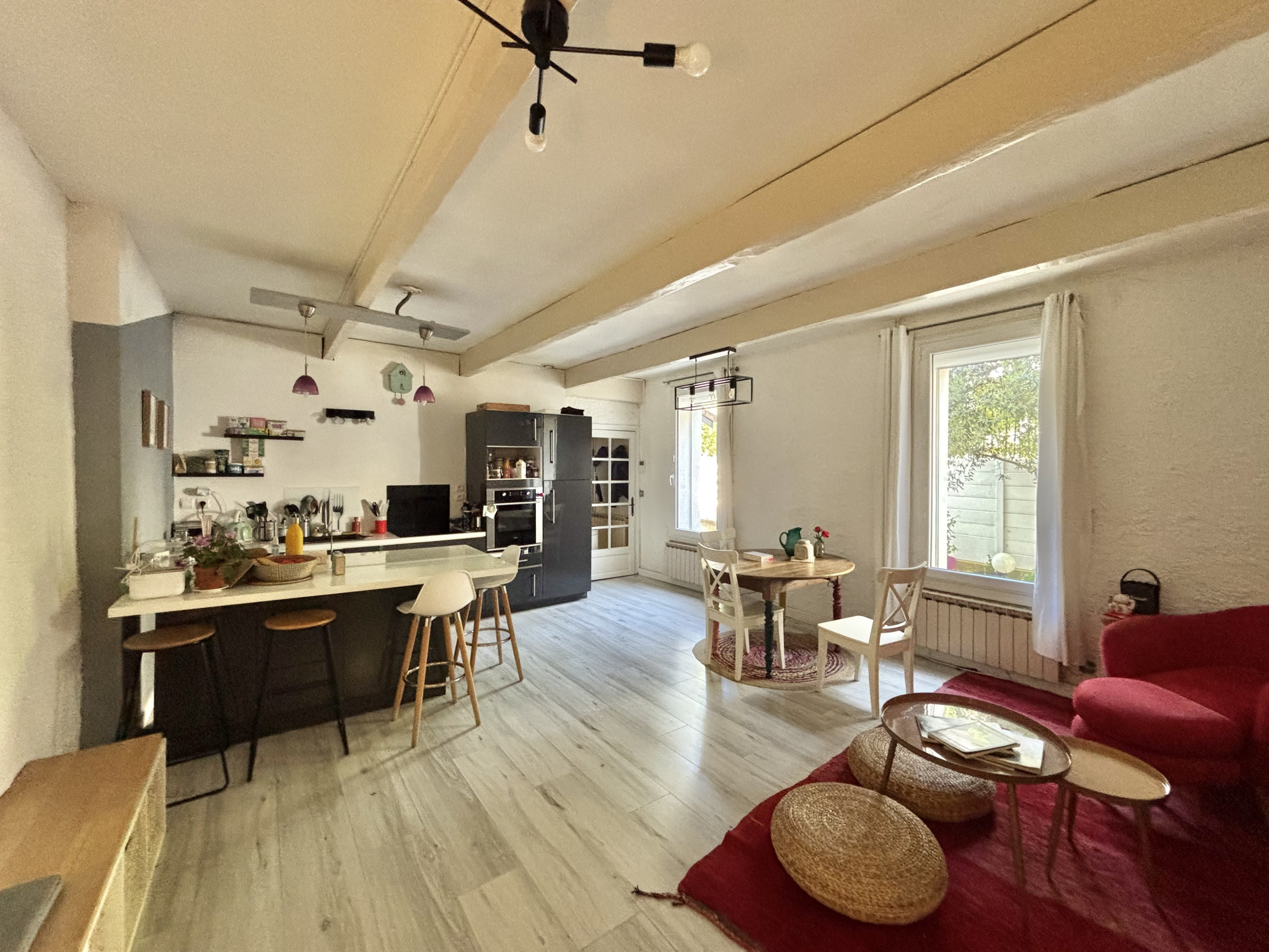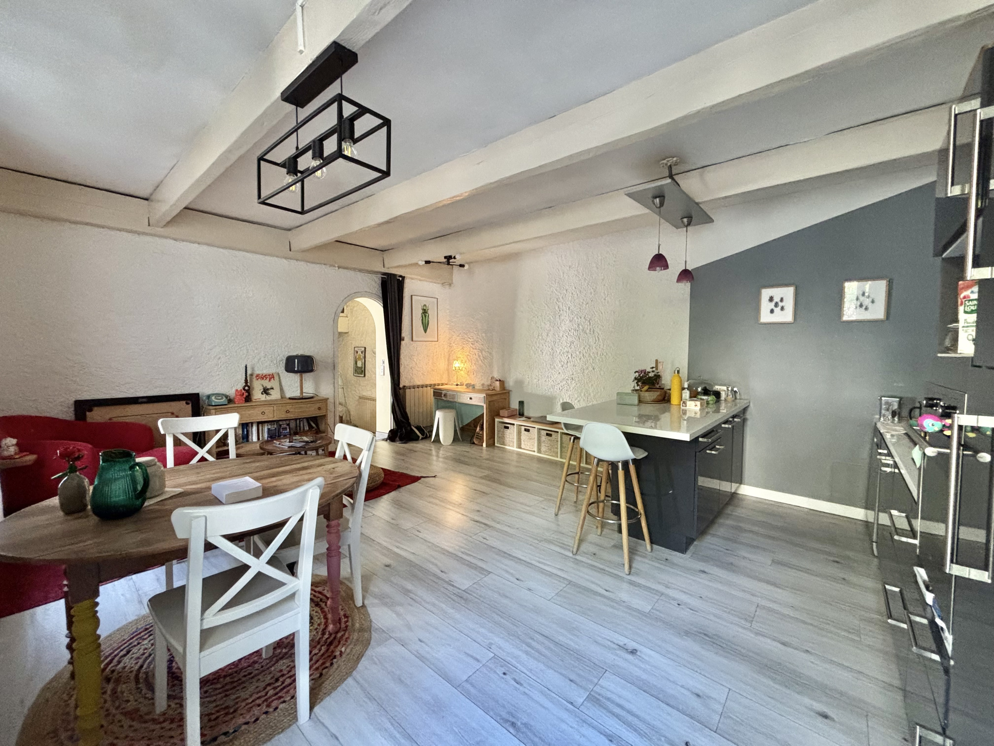 La maison s'articule ensuite autour d'une spacieuse cuisine rénovée de 29 m2, véritable coeur de vie, idéale pour recevoir et partager des moments conviviaux. Dans la continuité, le salon de plus de 22 m2, avec ses tomettes et son insert bois, apporte un charme authentique et une ambiance chaleureuse, avec un accès direct à l'extérieur.