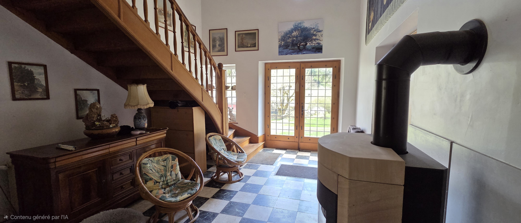 La maison est saine et entretenue : la charpente est en parfait état et la couverture a été partiellement rénovée dans les années 2000. Côté confort, elle bénéficie d'un système de chauffage performant installé en 2012 avec une chaudière à pellets alimentant les deux logements, complétée par un impressionnant poêle de masse de 100 kW au centre de l'habitation principale et des panneaux solaires pour la production d'eau chaude. L'électricité a été modernisée en 2012 et l'assainissement par fosse septique a été remis aux normes en 2017. L'isolation est assurée par des murs en pierre épais et une isolation en laine de bois au sol du grenier.