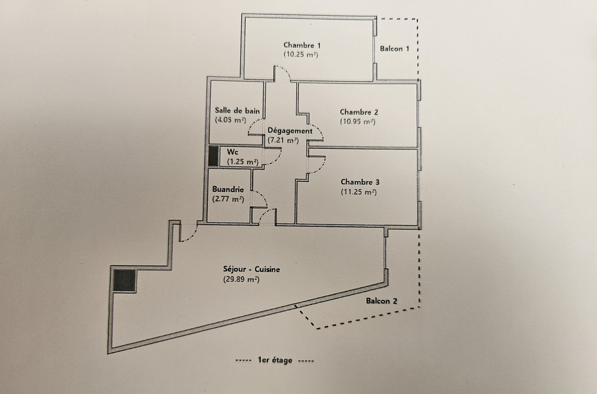 3 chambres (10,25 m2 / 10,95 m2 / 11,25 m2)