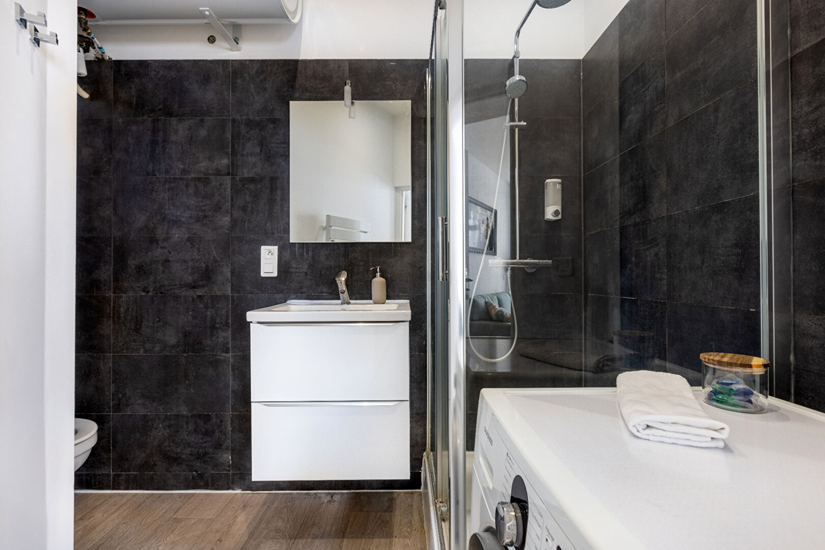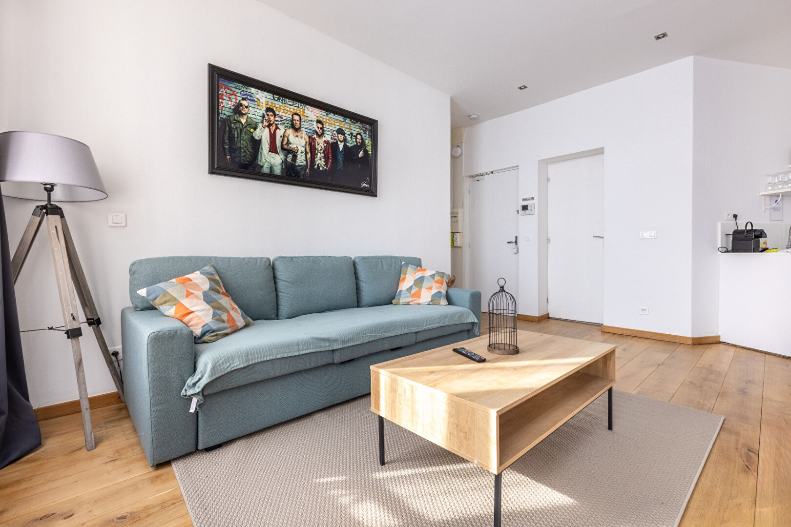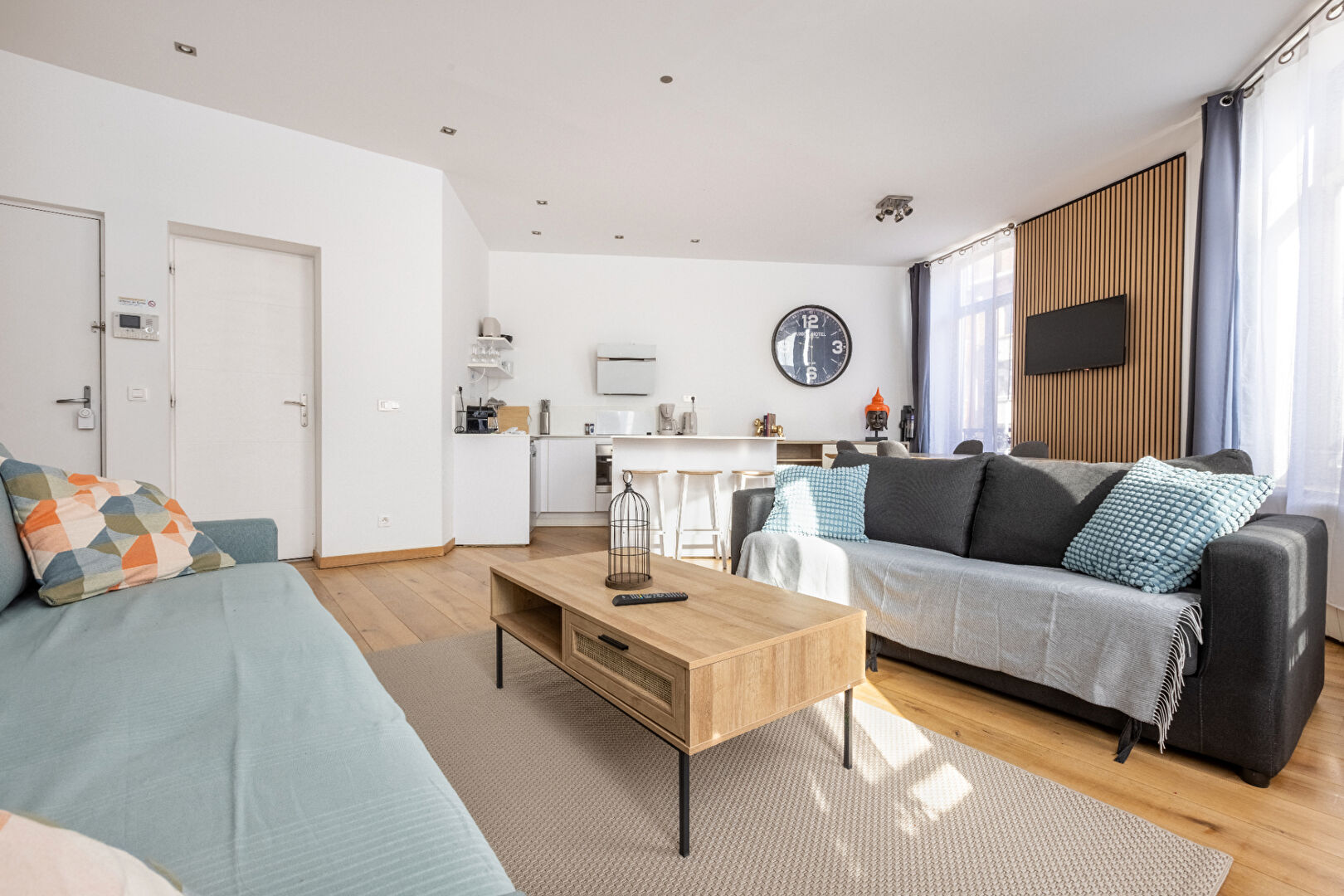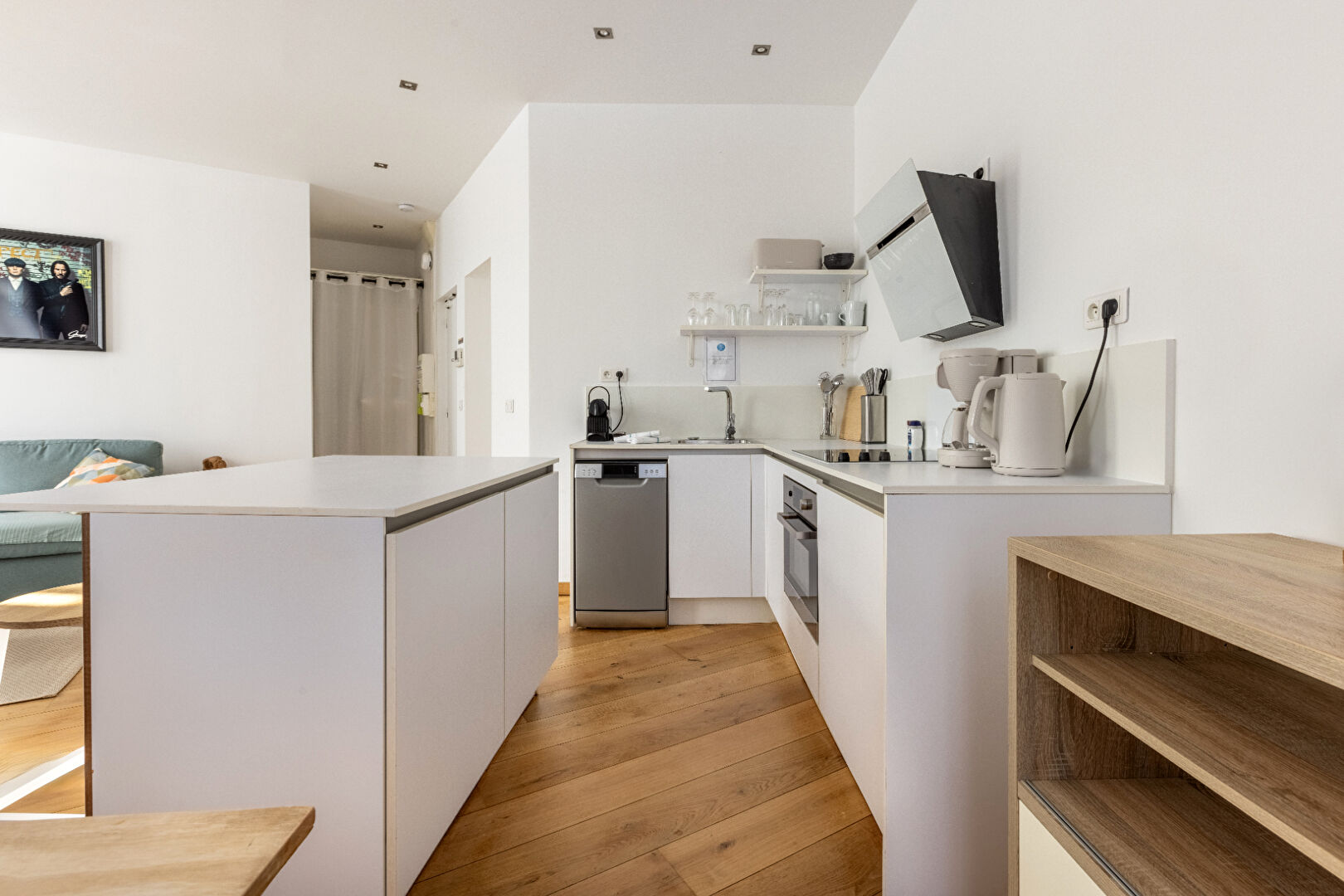 La pièce de vie, particulièrement généreuse, accueille une cuisine parfaitement équipée, intégrée dans un ensemble aux finitions soignées, dans un esprit contemporain aux accents hôteliers.