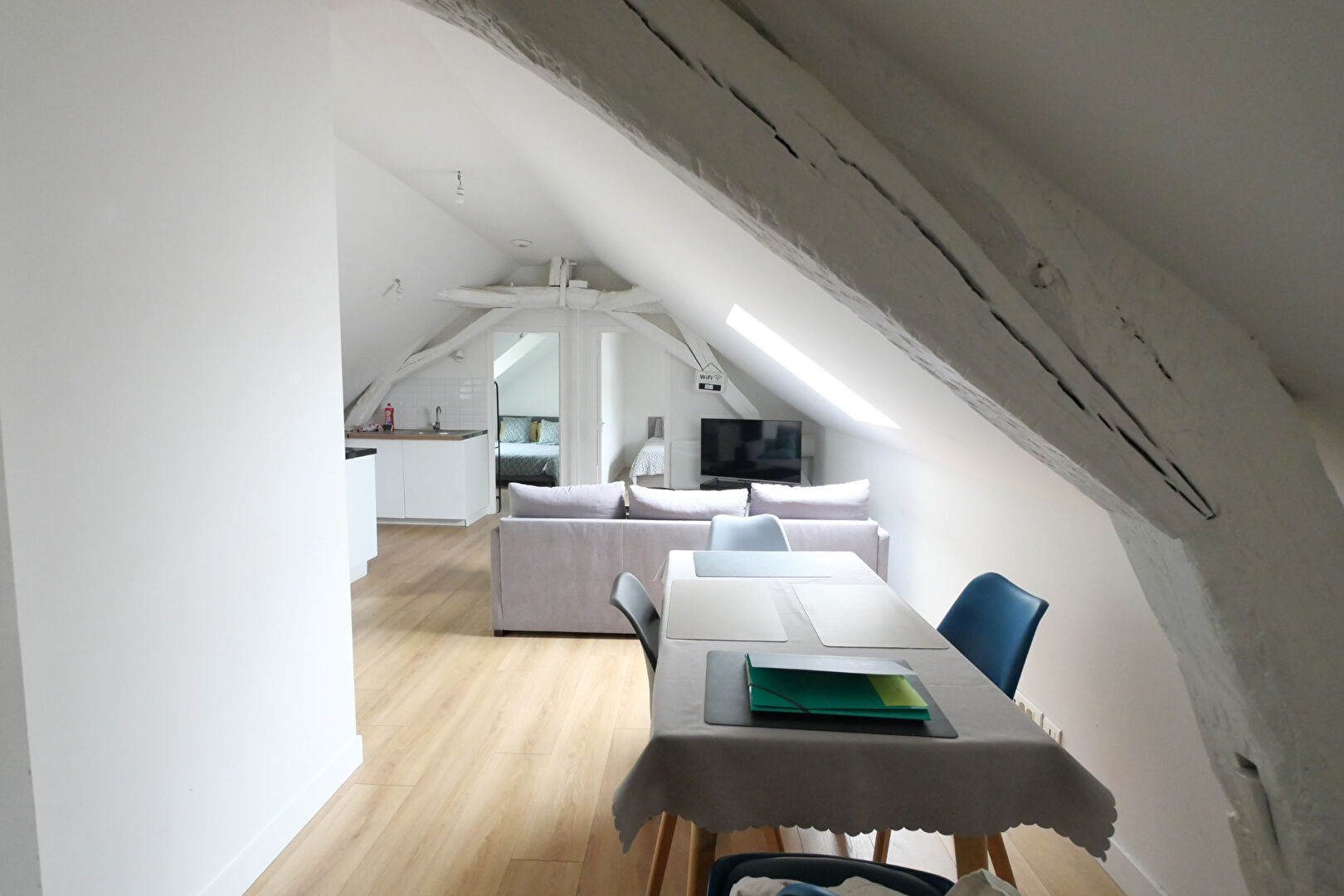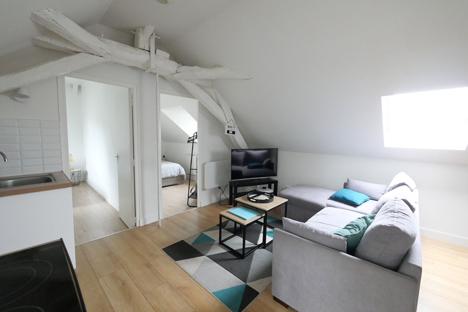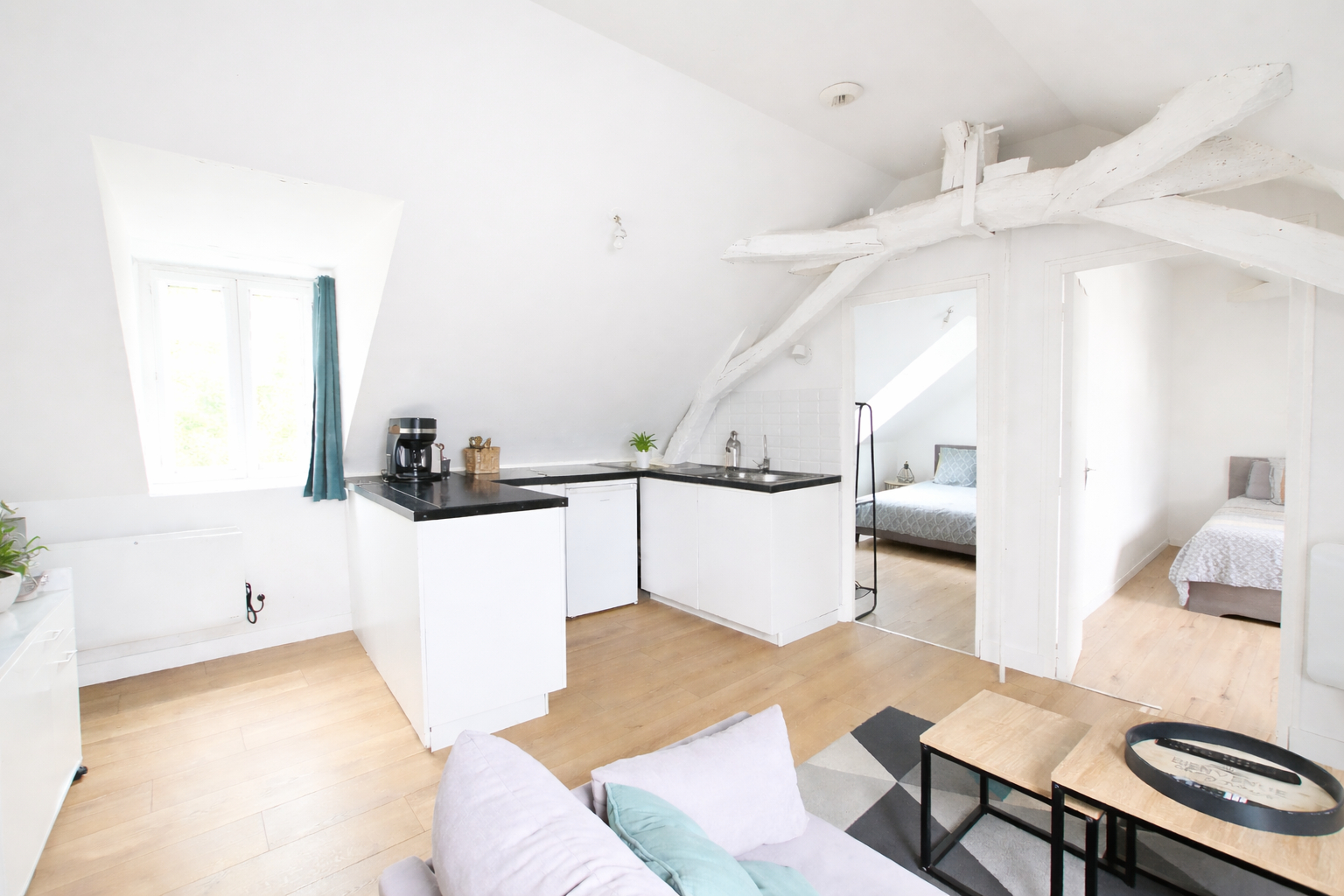 D'une surface de 55 m² au sol, il se compose : d'une entrée ouvrant sur la pièce de vie, cuisine ouverte aménagée et équipée, deux espaces chambres d'une salle d'eau et d'un wc séparé.