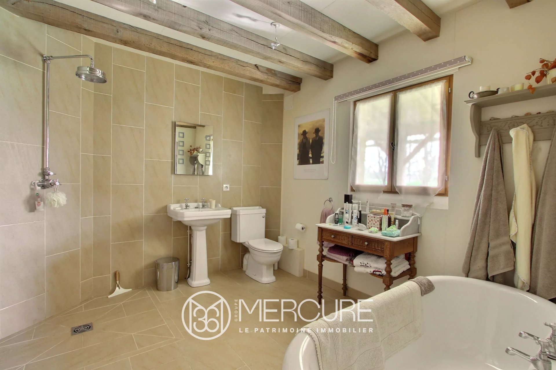 Entre Bergerac et Libourne, maison de campagne 230 m², construction récente mais selon des méthodes traditionnelles composée d'une cuisine moderne 20m², un grand séjour avec une cheminée et une partie salle à manger, une grande chambre et sa salle de bain au RDC + deux chambres avec salle de bain chacune à l'étage, WC, salle de jeux, chauffage électrique au sol au RDC, double vitrage, parquet, poutres apparentes, terrasse couverte