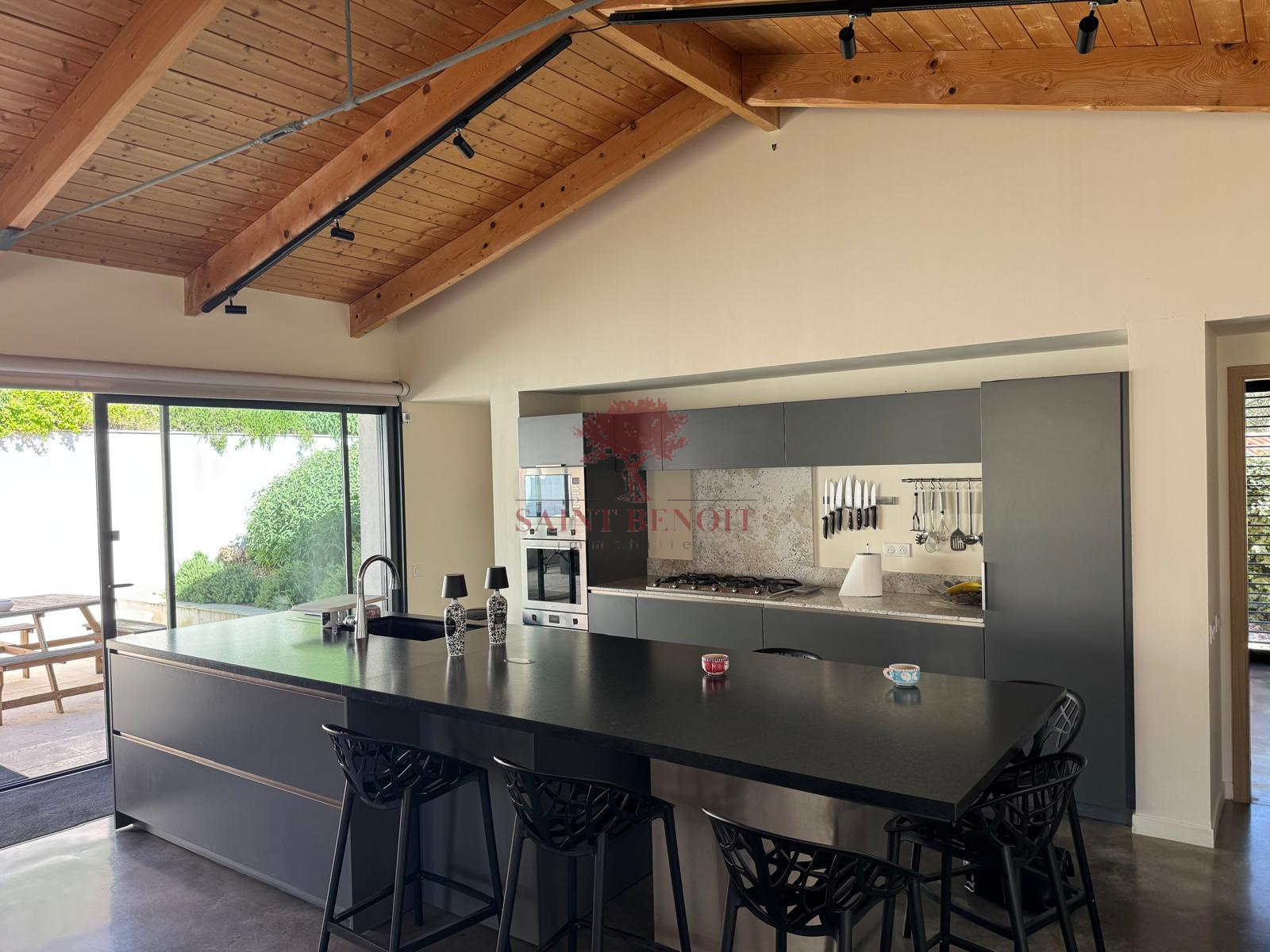 Dès l'entrée, la maison séduit par son architecture contemporaine et ses volumes généreux. La pièce de vie, baignée de lumière grâce à de larges baies vitrées à galandage, développe 70 m2 et s'ouvre harmonieusement sur les extérieurs et la piscine. Elle est sublimée par une cheminée et une cuisine ouverte entièrement équipée aux prestations soignées.