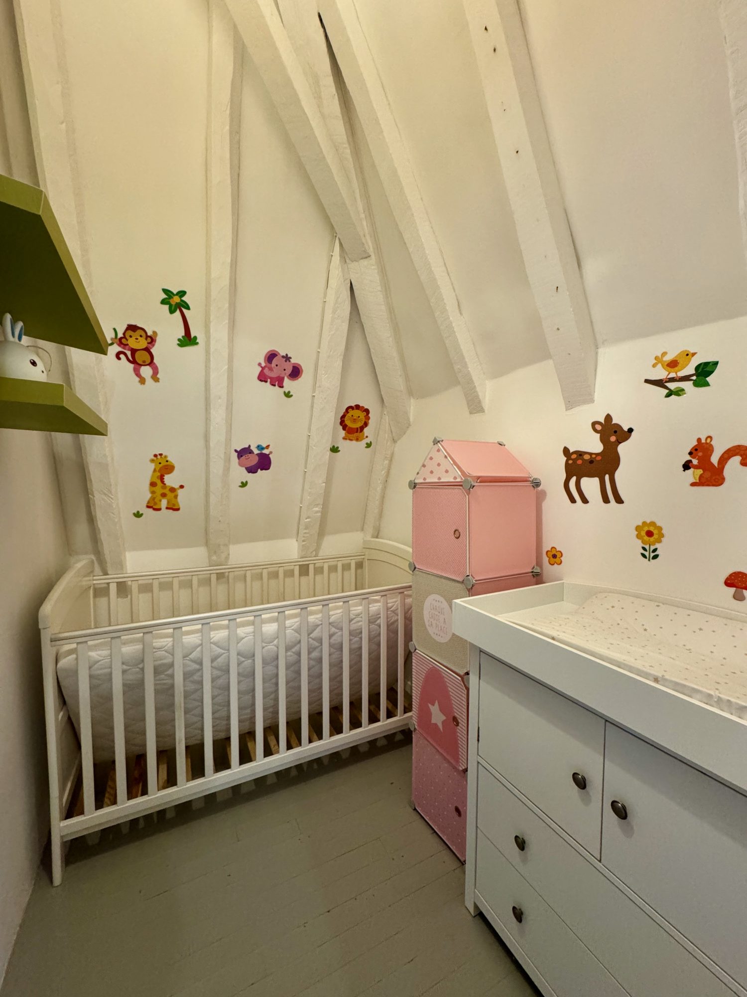 À l'étage, le premier étage comprend trois grandes chambres doubles, toutes dotées de murs en colombage apparents et de parquet en chêne. Une quatrième pièce, actuellement utilisée comme chambre de bébé, peut facilement être aménagée en bureau, salle de jeux ou espace de rangement supplémentaire. La chambre principale bénéficie d'une salle d'eau privative, tandis que les deux autres chambres partagent une salle d'eau familiale moderne.