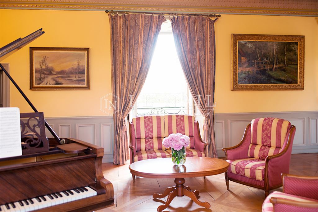 Au premier étage du logis, une cuisine semi professionnelle, salle à manger avec de belles boiseries du XVIIème, petit salon vert dans la tour de l’Ouest, un grand salon au plafond peint dans le style du XVIIIème siècle, le bureau de la direction dans la tour de l’Est.