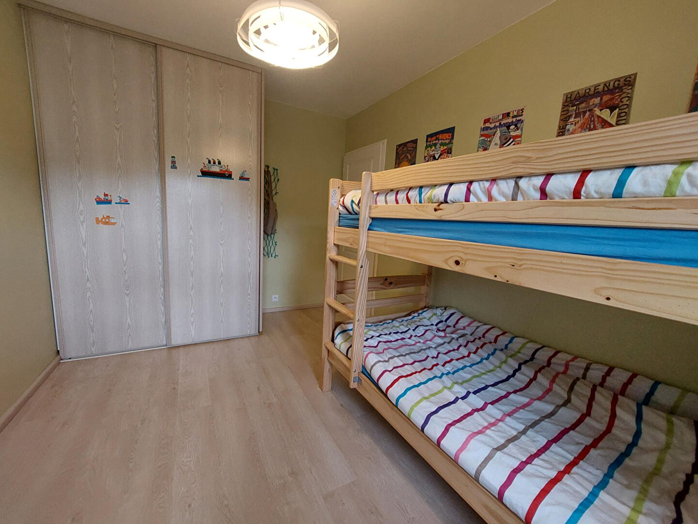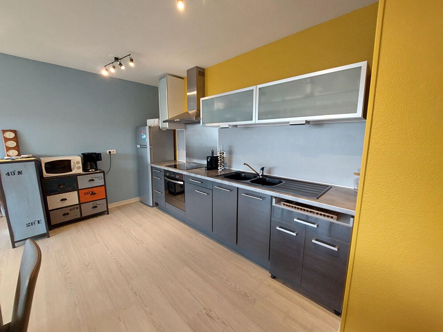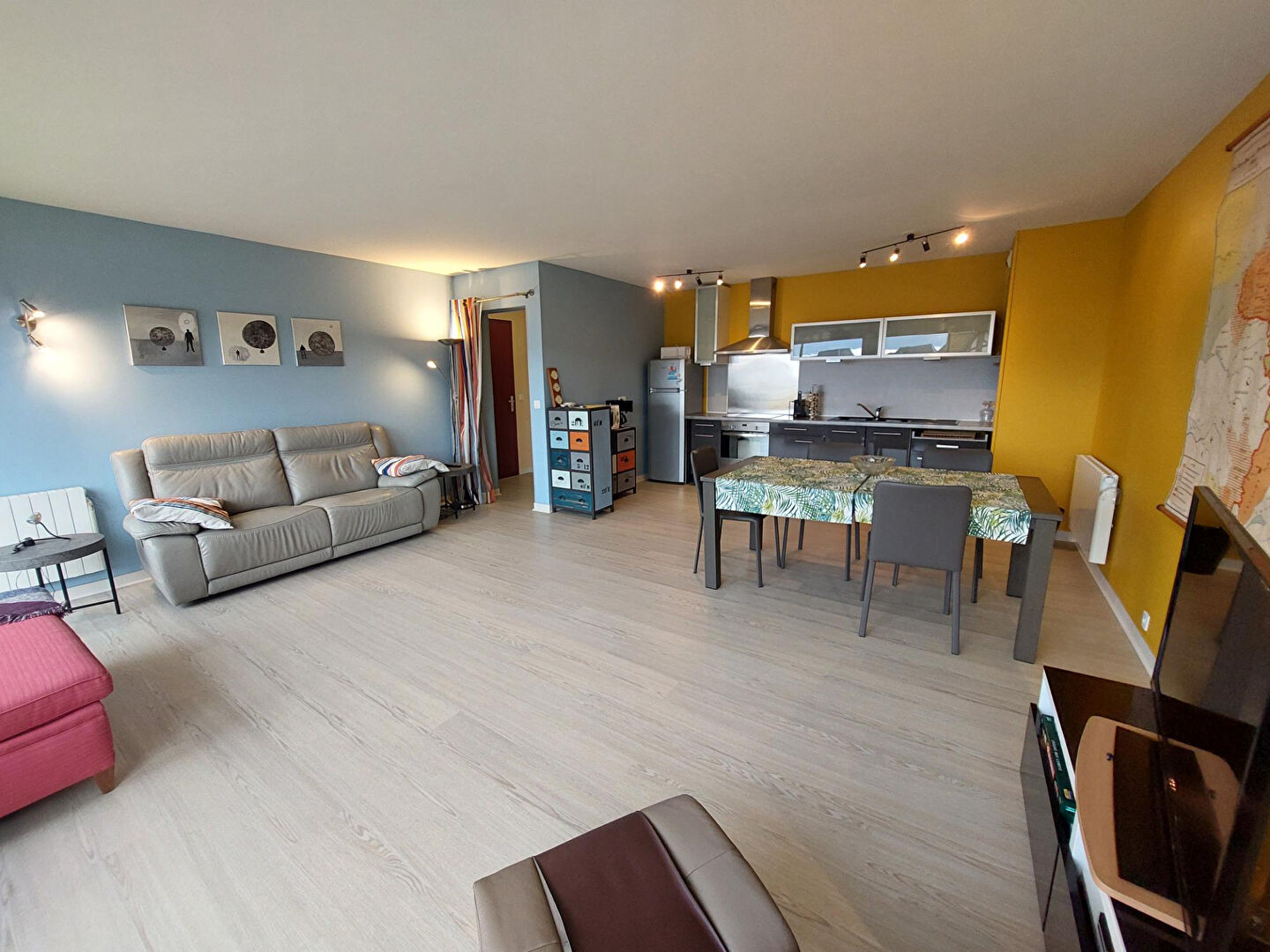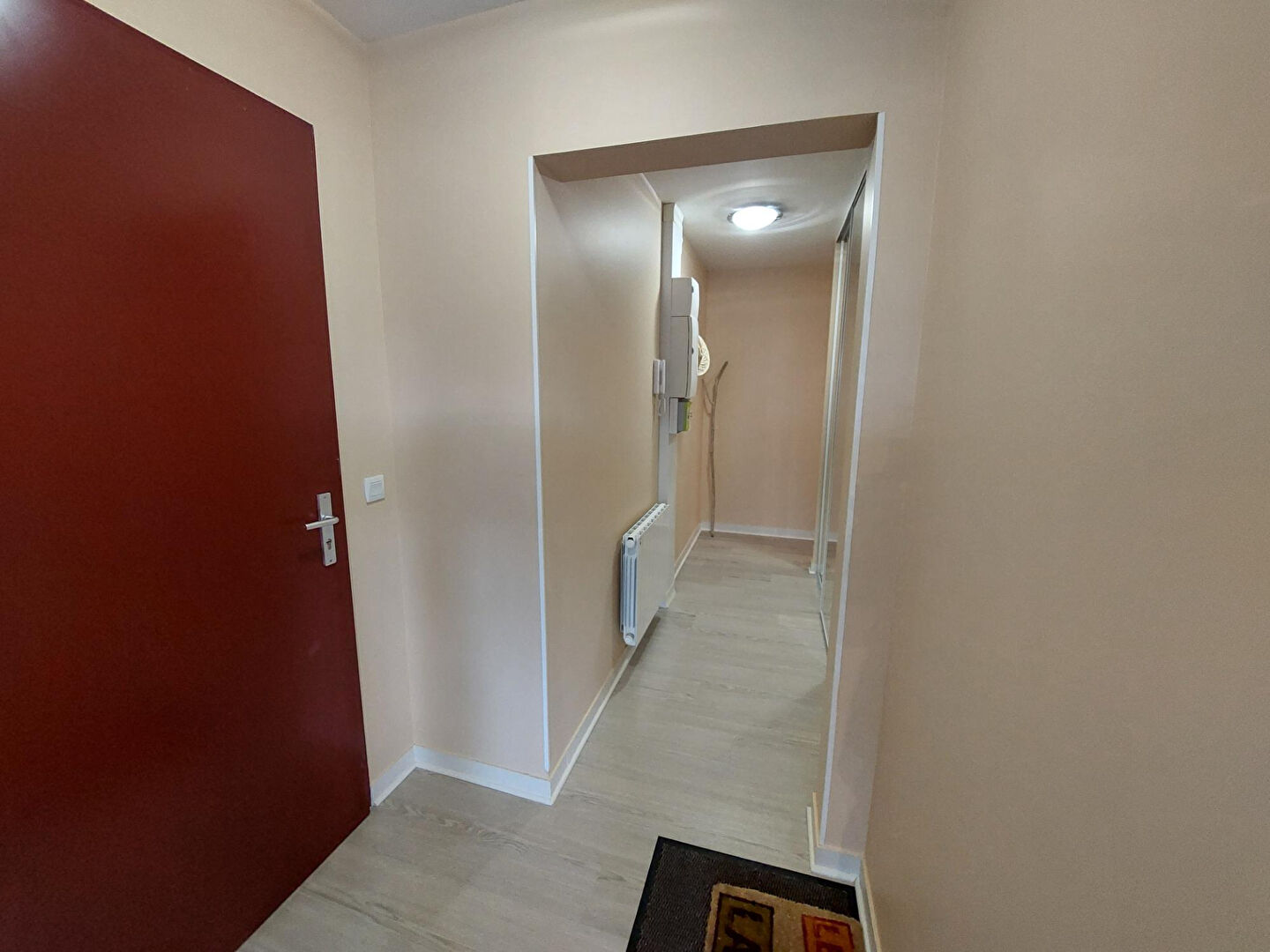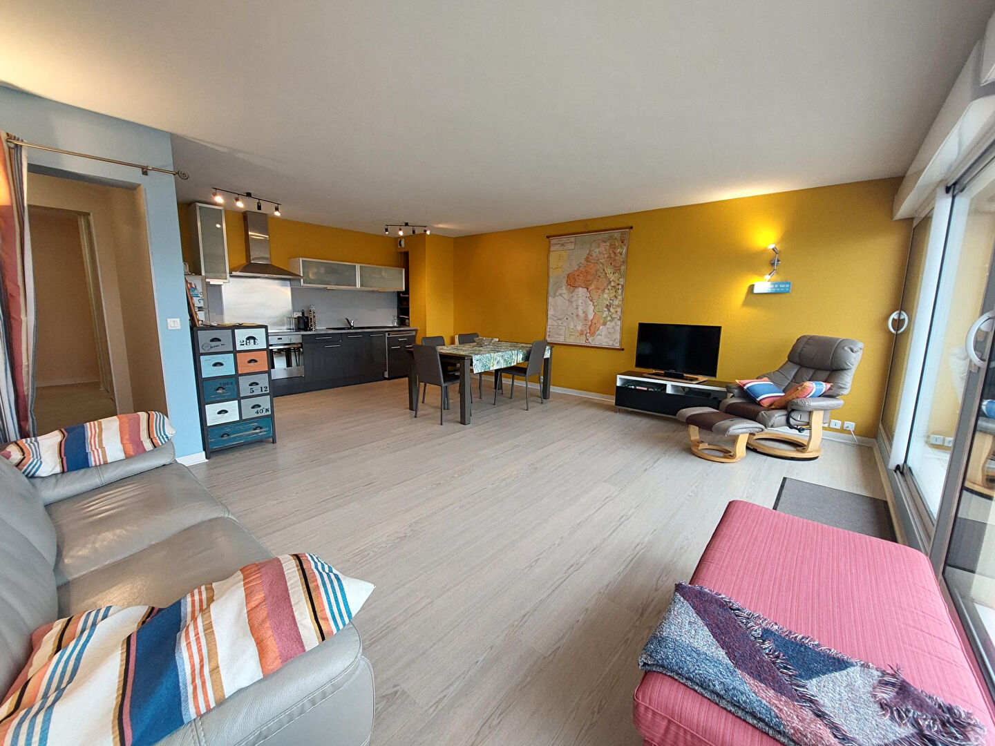 hall d'entrée donnant sur séjour - salle à manger (baies coulissantes - balcon), cuisine ouverte aménagée et équipée, couloir desservant deux chambres, sanitaire avec lavabo, salle de bains avec douche et baigno