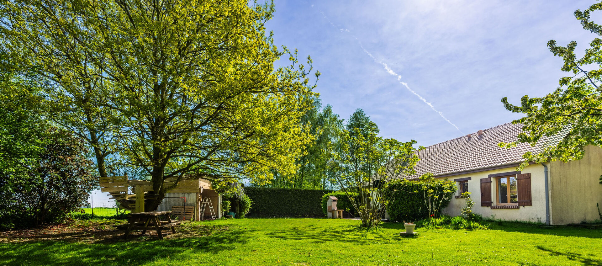 Garage accolé à la maison comprenant un espace cellier. Beau jardin paysagé de 1 527m²