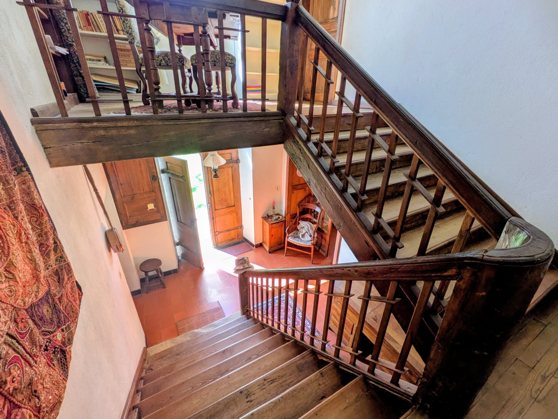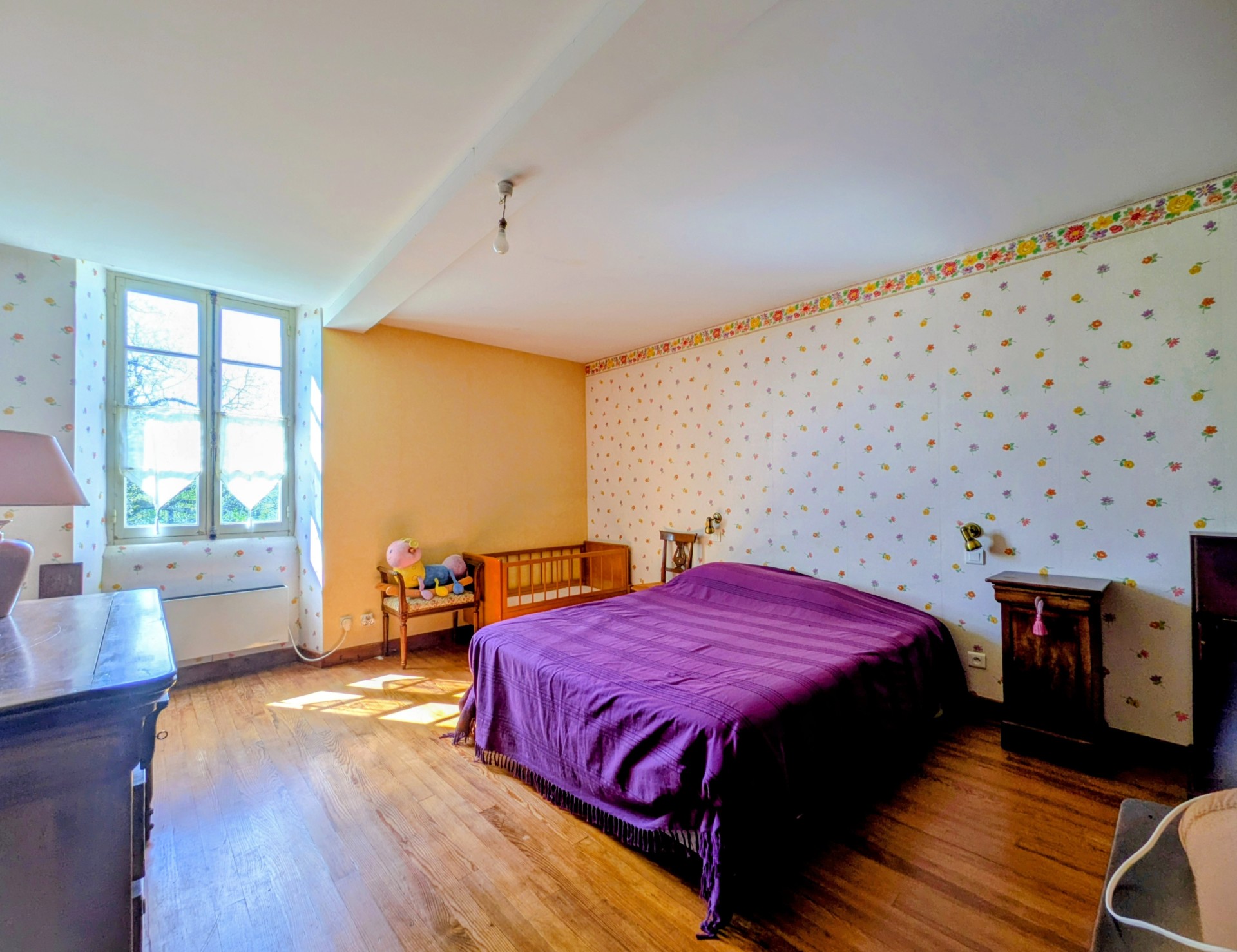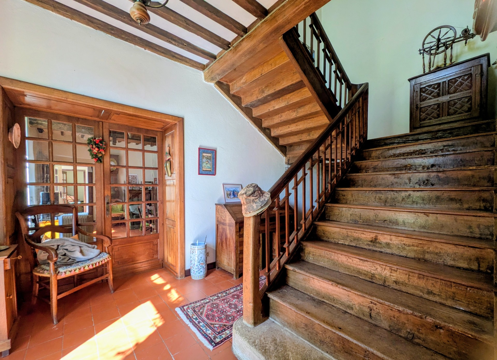 La maison s?organise autour des pièces de vie exposées au sud, où l?on retrouve le charme de l?ancien avec sa cheminée d?origine et ses poutres apparentes. Un escalier d?époque menant à un grand palier qui dessert 4 chambres.