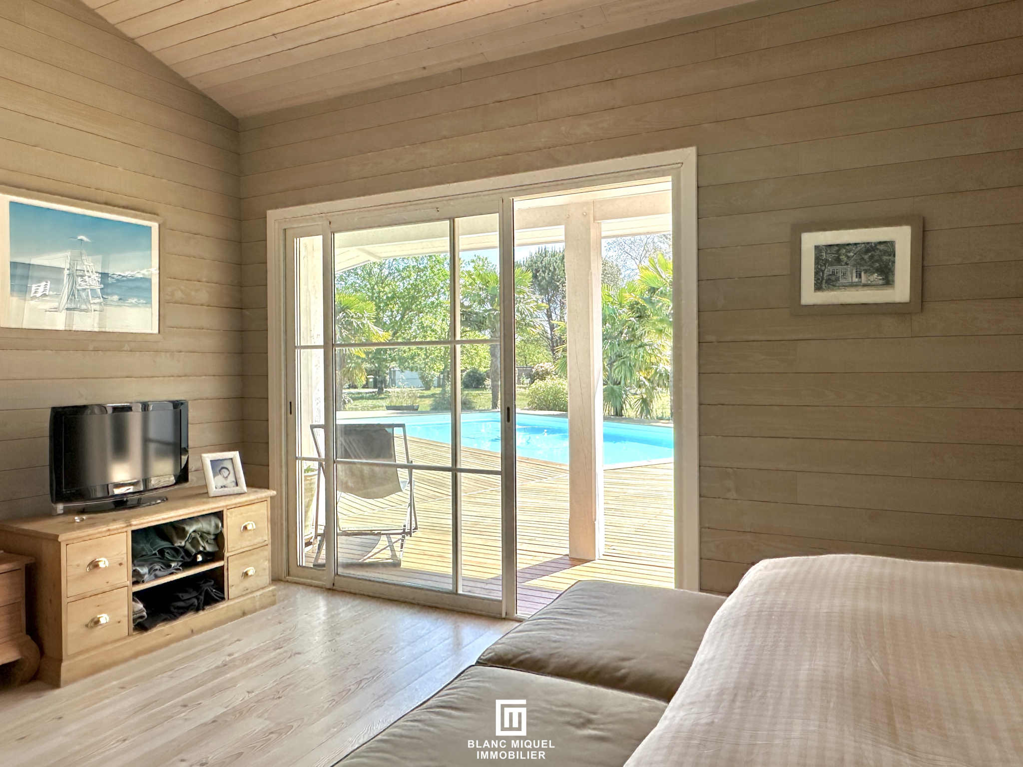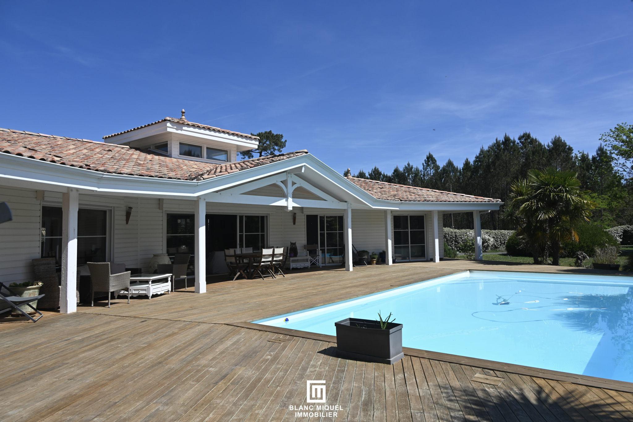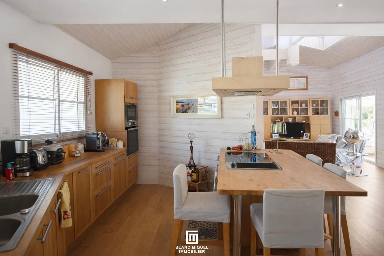 SALLES -Laissez-vous séduire par cette élégante maison en bois nichée dans un écrin de verdure au coeur des pins, à seulement quelques minutes du centre de Salles. Entièrement de plain-pied et organisée en U, elle offre de beaux volumes et une luminosité omniprésente avec une ouverture constante sur le jardin paysager et sa piscine. La pièce de vie centrale accueille un vaste séjour- cathédrale avec cuisine ouverte et salle à manger tournée vers l'extérieur. La suite parentale, raffinée, dispose d'un dressing et d'une salle de bains spacieuse et lumineuse. Un bureau dessert une seconde aile composée de deux jolies chambres avec rangements et d'une salle de bains. Un cellier, une dépendance et un double carport complètent ce bien aux prestations de qualité, incluant un système de chauffage/eau chaude par géothermie (DPE A). Idéal pour une vie paisible entre nature et commodités, à proximité de Salles et du CEA. Accès rapide (20 à 30 minutes) du Teich et aux plages du Bassin d'Arcachon.