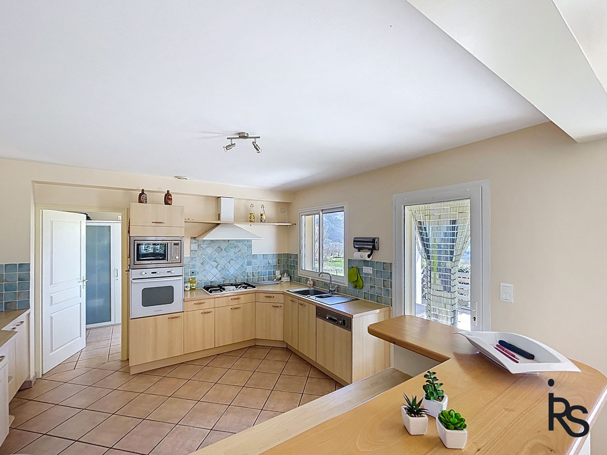 À l'orée d'un charmant petit village, une villa de 144 m2 habitables avec terrasse et 1138 m2 de jardin et une belle vue sur les montagnes au loin. La maison comprend une grande pièce de vie « cathédrale » avec une cheminée, une cuisine ouverte intégrée et une spacieuse buanderie, 4 chambres, une salle de bains, une salle d'eau, 2 W.C., une chaufferie, un grenier, un garage et un abri pour 2 véhicules. Chauffage au sol réversible (chaudière et pompe à chaleur) et eau chaude solaire (thermique et photovoltaïque). Fosse septique. Petits commerces à 10 minutes.