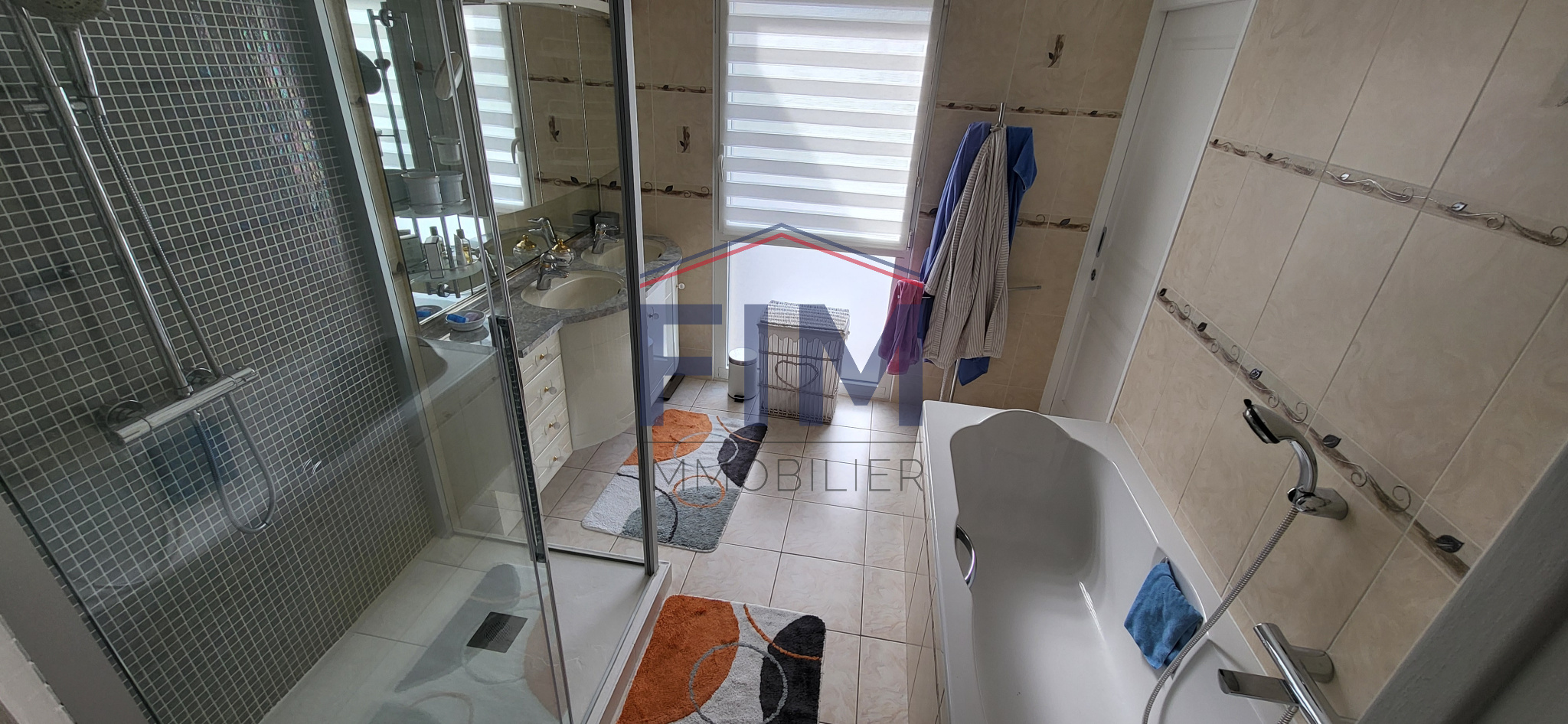 Pavillon de plain pied d'une surface habitable de 130 m2 environ comprenant :une entrée avec penderie, séjour-salon avec cheminée insert accès à la terrasse de 40 M2 env. , cuisine équipée et arrière cuisine, un cellier donnant accès au garage, 1 bureau, 3 chambres dont 1 avec suite parentale, salle de bains, wc, 2 bâtiments, un abri bois, aspirateur centralisé, panneaux solaires, fenêtre double vitrage en aluminium avec volets roulants électriques, Tout à l'égout. Pompe à chaleur , double garage, terrain 1400 m2 environ.
