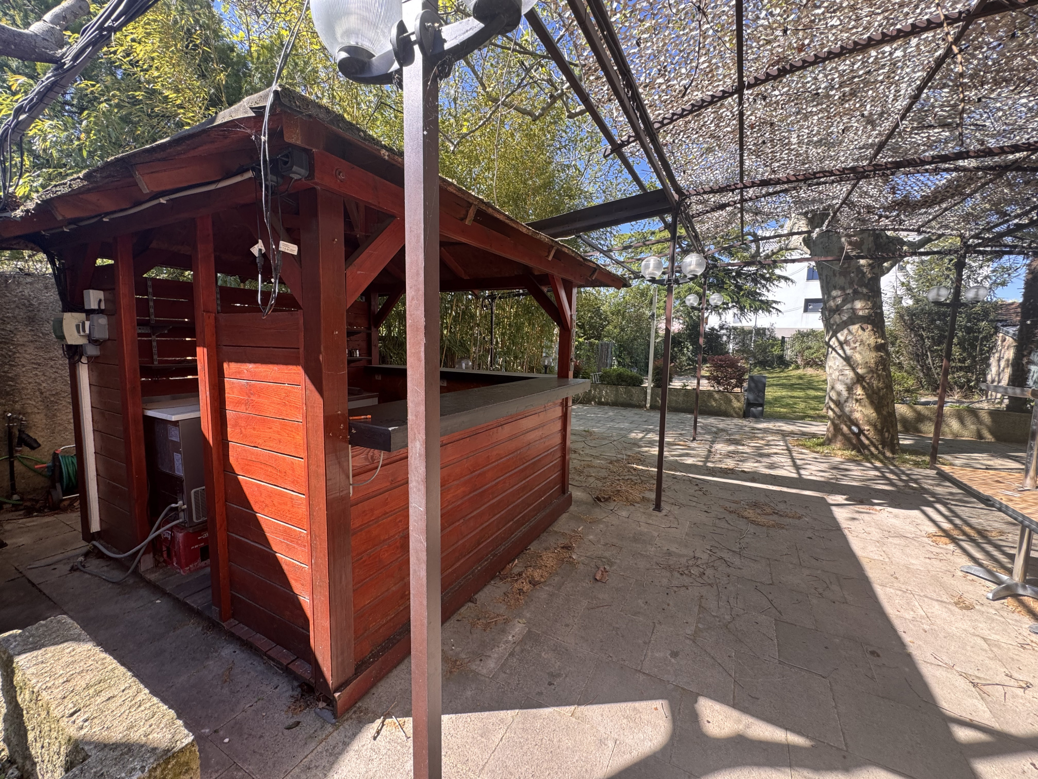 Les extérieurs offrent de véritables atouts avec une terrasse, un bar extérieur, un terrain de pétanque et un four à pizza, créant un lieu convivial et attractif.
