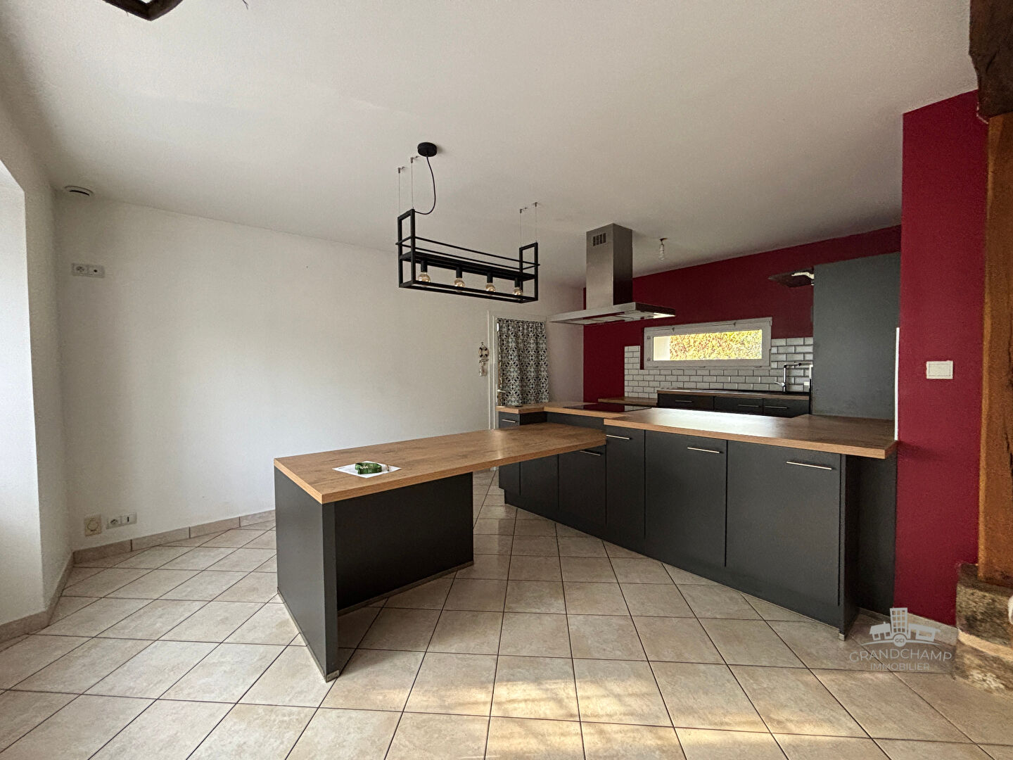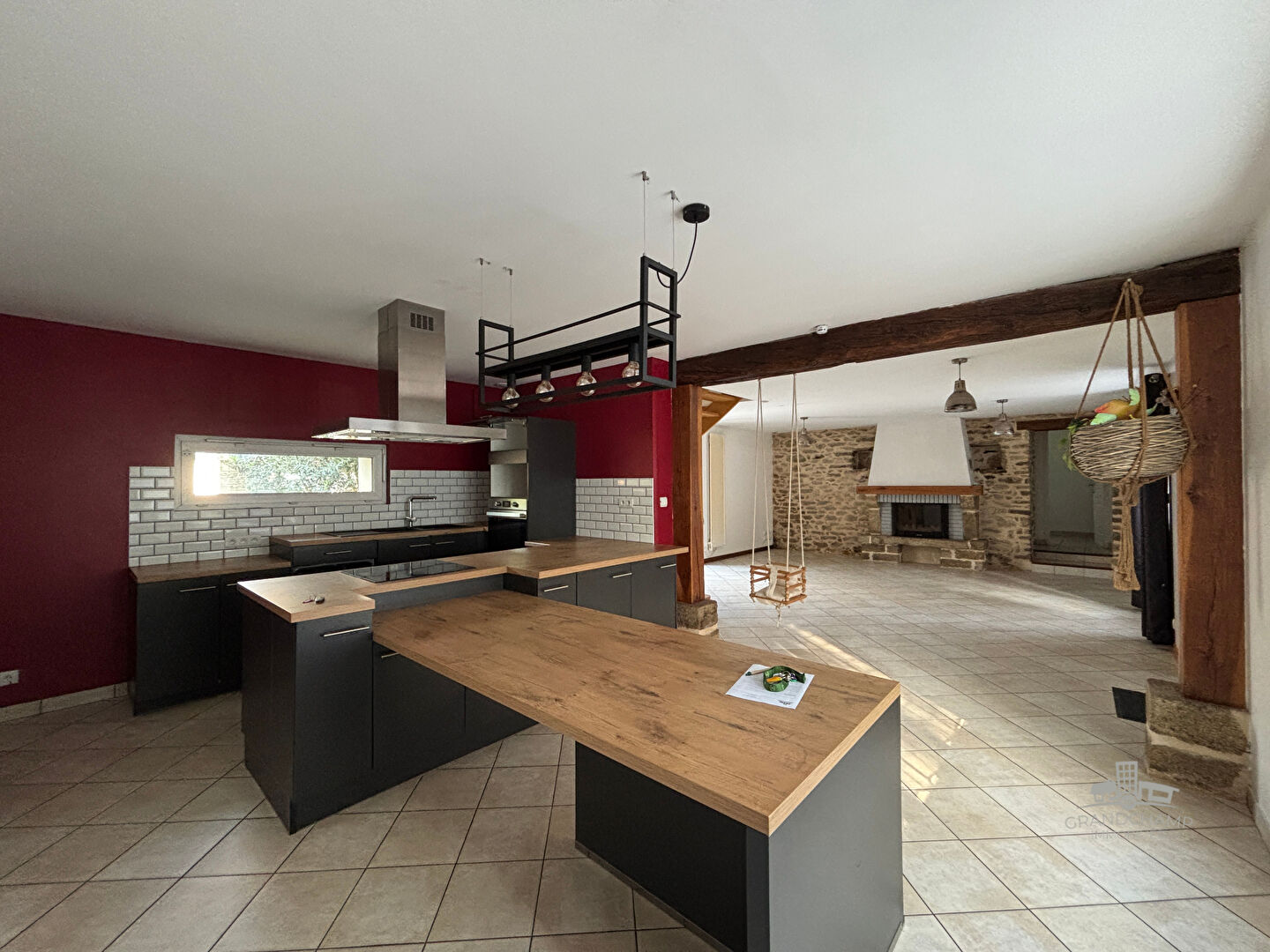 En RDC : une spacieuse pièce de vie de plus de 50 m² comprenant un espace salon chaleureux avec cheminée insert et un coin repas convivial avec cuisine aménagée et équipée.