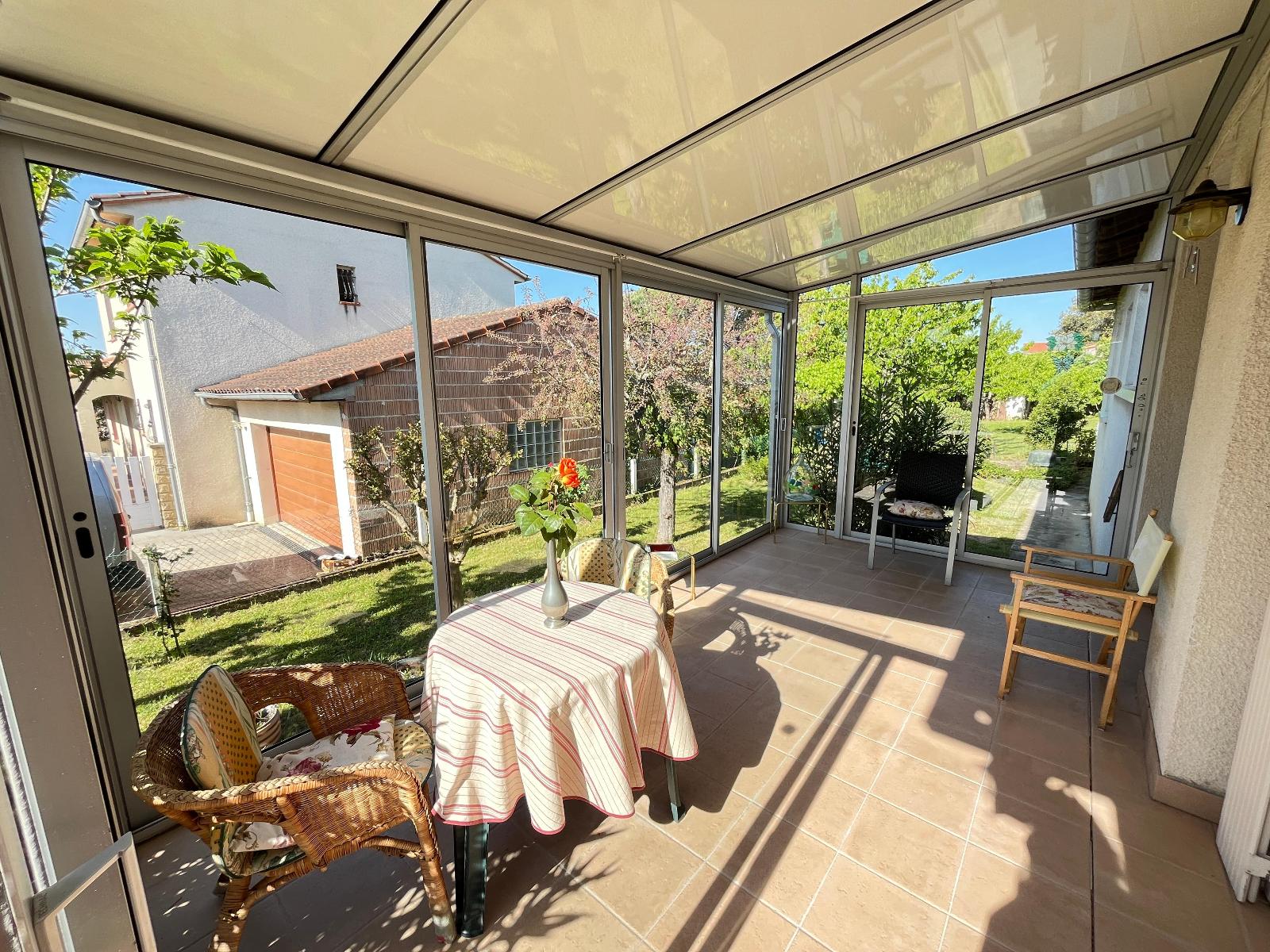 L'entrée s'effectue par une véranda lumineuse, entièrement ouvrable grâce à ses larges baies vitrées. Elle mène à une pièce de vie chaleureuse dotée d'une cheminée, avec un accès direct à la véranda.