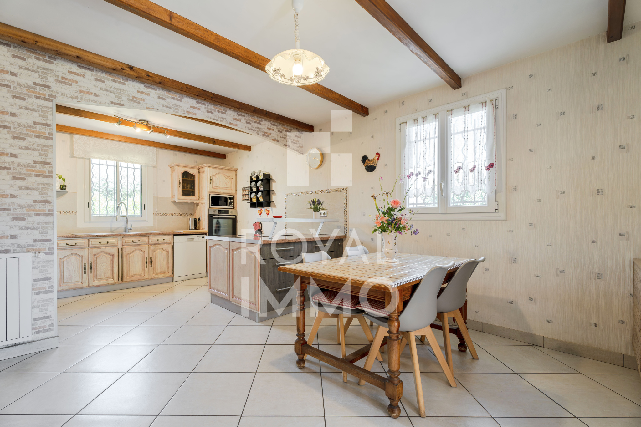 La maison offre une grande cuisine conviviale, idéale pour recevoir, ainsi qu'une véranda et une belle terrasse permettant de profiter de différents espaces de vie au fil des saisons.