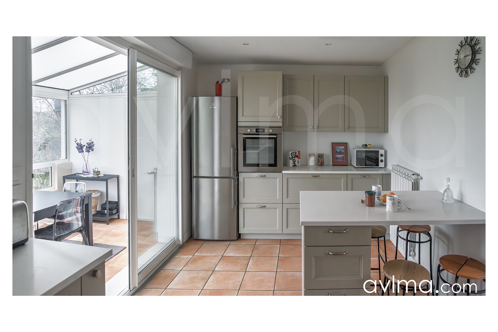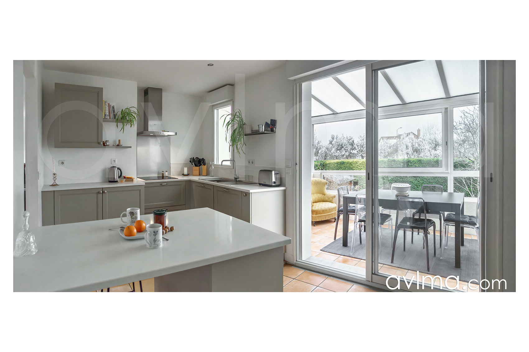 - le deuxième niveau constitue l'espace familial. Le grand salon avec cheminée bénéficie d'une luminosité appréciable, et se poursuit vers une pièce qui peut servir de chambre, bureau ou salle TV. La spacieuse cuisine aménagée se prolonge vers la véranda.